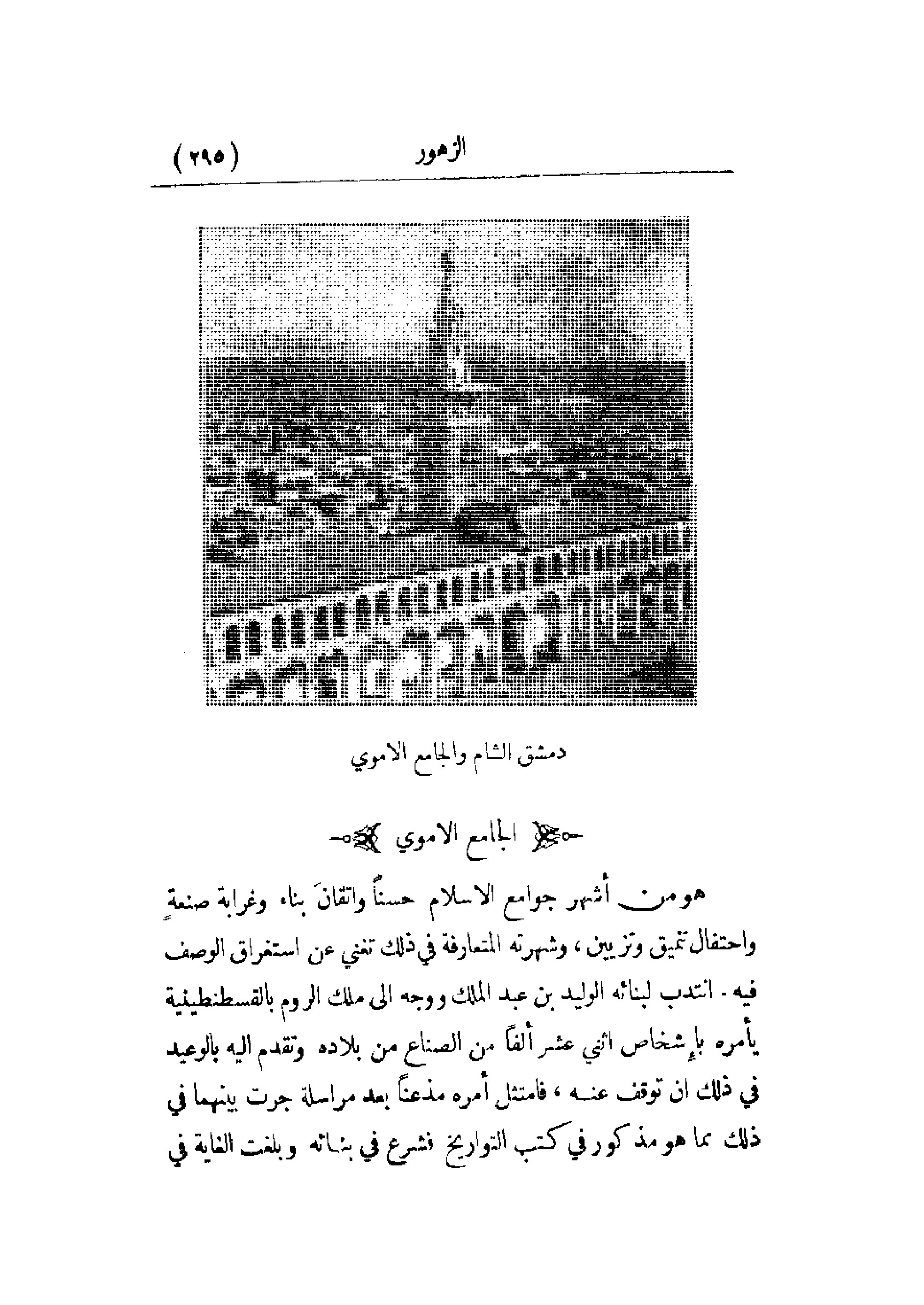 هو من أشهر جوامع الإسلام حسناً وإتقان بناء وغرابة صنعة واحتفال تنميق وتزيين، وشهرته المتعارفة في ذلك تغني عن استغراق الوصف فيه. انتدب لبنائه الوليد بن عبد الملك ووجه إلى ملك الروم بالقسطنطينية يأمره بإشخاص اثني عشرا ألفاً من الصناع من بلاده وتقدم إليه بالوعيد في ذلك إن توقف عنه، فامتثل أمره مذعناً بعد مراسلة جرت بينهما في ذلك مما هو مذكور في كتبا لتواريخ فشرع في بنائه وبلغت الغاية في
