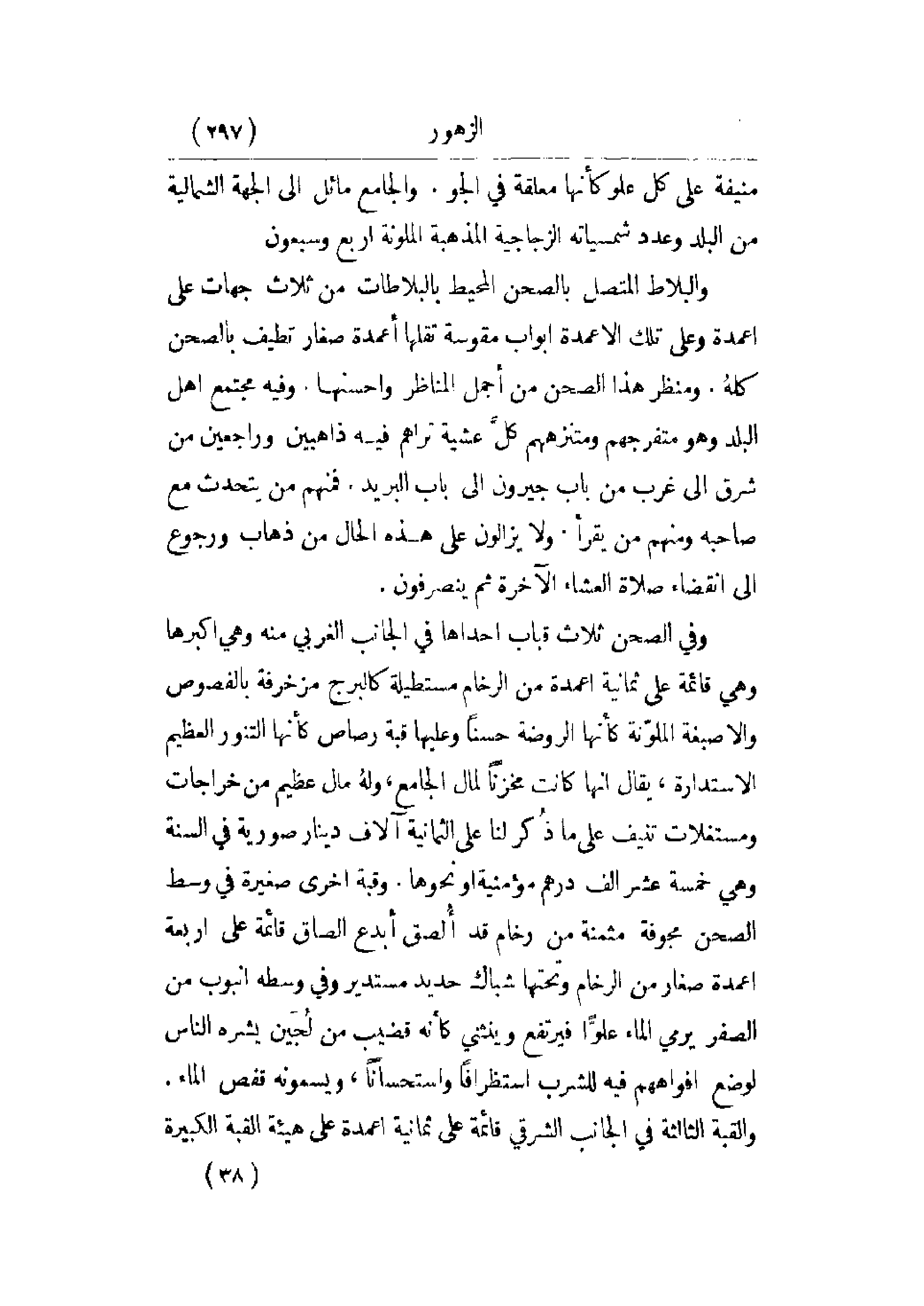 أبواب مقوسة تقلها أعمدة صغار تطيف بالصحن كله. ومنظر هذا الصحن من أجمل المناظر وأحسنها. وفيه مجتمع أهل البلد وهو متفرجهم ومتنزههم كل عشية تراهم فيه ذاهبين وراجعين من شرق إلى غرب من باب جيرون إلى باب البريد. فمنهم من يتحدث مع صاحبه ومنهم من يقرا. ولا يزالون على هذه الحال من ذهاب ورجوع إلى انقضاء صلاة العشاء الآخرة ثم ينصرفون.