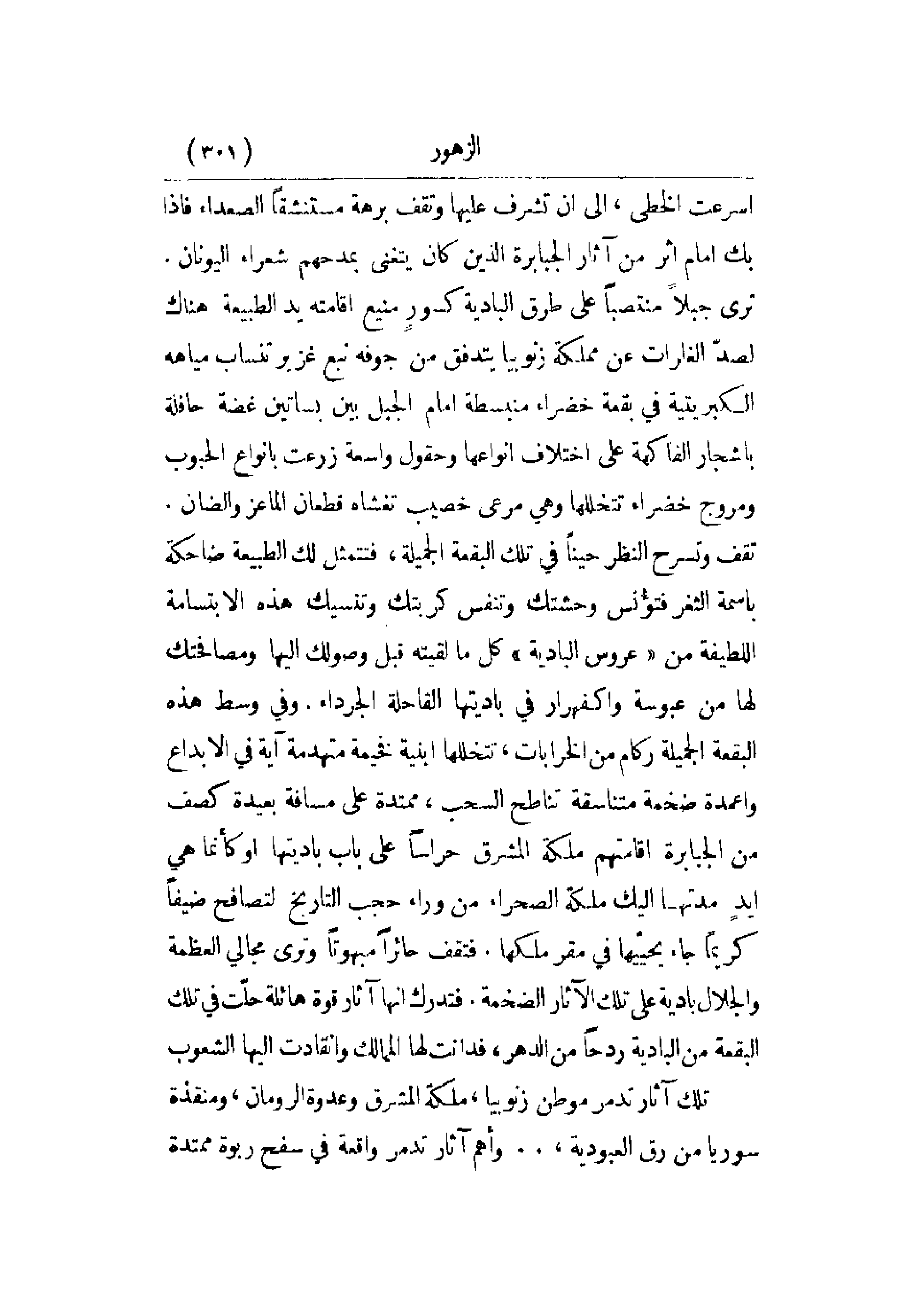 أسرعت الخطى، إلى أن تشرف عليها وتقف برهة مستنشقاً الصعداء فإذا بك أمام أثر من آثار الجبابرة الذين كان يتغنى بمدحهم شعراء اليونان. ترى جبلاً منتصباً على طرق البادية كسور منيع أقامته يد الطبيعة هناك لصد الغارات عن مملكة زنوبيا يتدفق من جوفه نبع غزير تنساب مياهه الكبريتية في بقعة خضراء منبسطة أمام الجبل بين بساتين غضة حافلة بأشجار الفاكهة على اختلاف أنواعها وحقول واسعة زرعت بأنواع الحبوب ومروج خضراء تتخللها وهي مرعى خصيب تغشاه قطعان الماعز والضان. تقف وتسرح النظر حيناً في تلك البقعة الجميلة، فتتمثل لك الطبيعة ضاحكة باسمة الثغر فتؤنس وحشتك وتنفس كربتك وتنسيك هذه الابتسامة اللطيفة من عروس البادية كلما لقيته قبل وصولك إليها ومصافحتك لها من عبوسة واكفهرار في باديتها القاحلة الجرداء. وفي وسط هذه البقعة الجميلة ركام من الخرابات، تتخللها أبنية فخيمة متهدمة آية في الإبداع وأعمدة ضخمة متناسقة تناطح السحب، ممتدة على مسافة بعيدة كصف من الجبابرة أقامتهم ملكة المشرق حراساً على باب باديتها أو كأنما هي أيدٍ مدتها إليك ملكة الصحراء من وراء حجب التاريخ لتصافح ضيفاً كريماً جاء يحييها في مقر ملكها. فتقف حائراً مبهوتاً وترى مجالي العظمة والجلال بادية على تلك الآثار الضخمة. فتدرك أنها آثار قوة هائلة حلت في تلك البقعة من البادية ردحاً من الدهر، فدانت لها الممالك وانقادت إليها الشعوب.