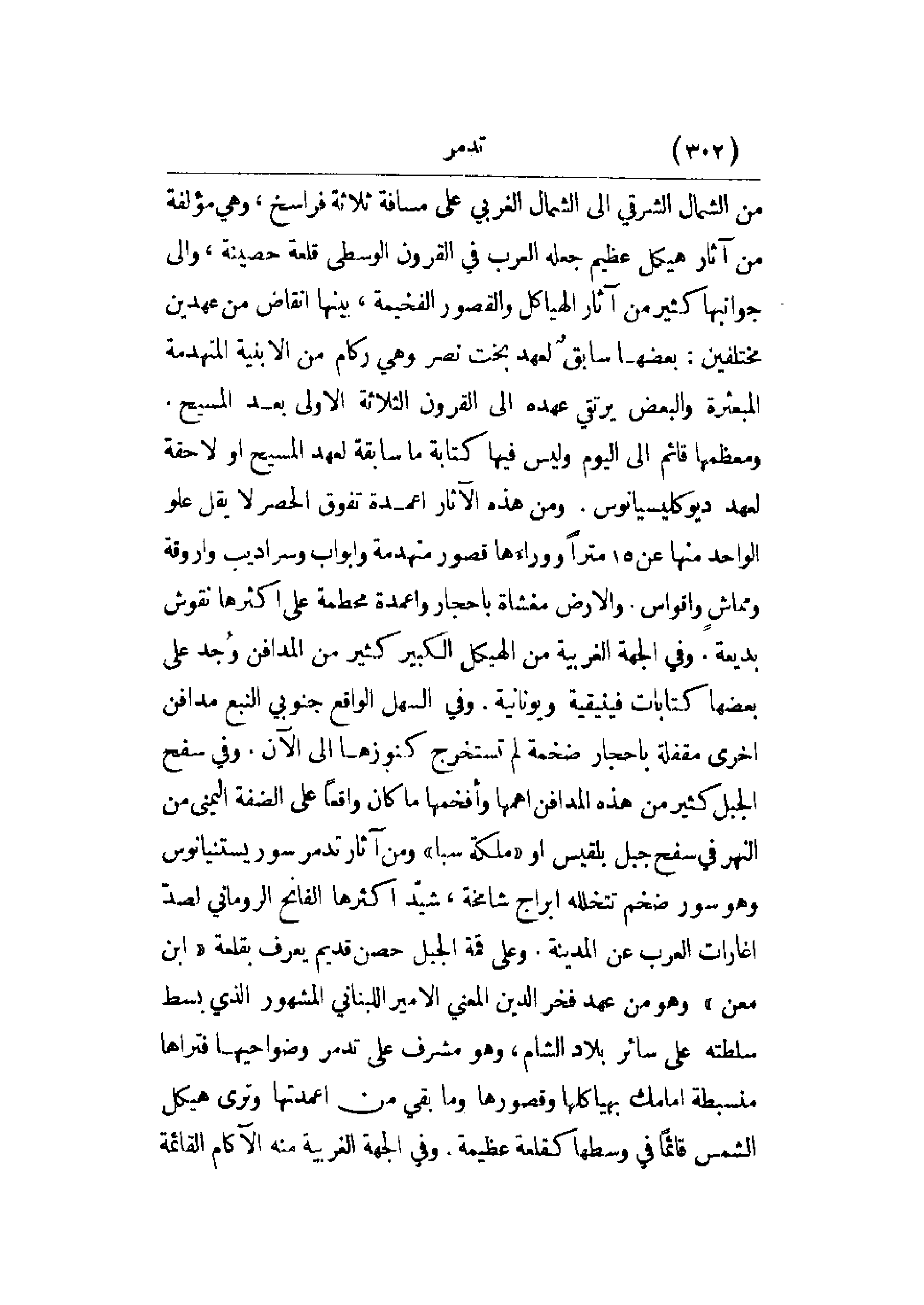 من الشمال الشرقي إلى الشمال الغربي على مسافة ثلاثة فراسخ، وهي مؤلفة من آثار هيكل عظيم جعله العرب في القرون الوسطى قلعة حصينة، وإلى جوانبها كثير من آثار الهياكل والقصور الفخيمة، بينها أنقاض