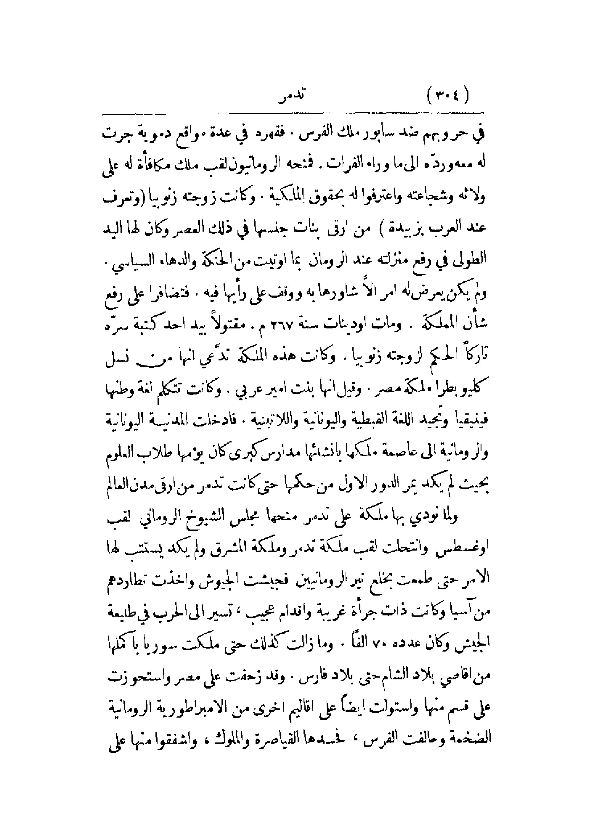 في حروبهم ضد سابور ملك الفرس. فقهره في عدة مواقع دموية جرت له معه ورده إلى ما وراء الفرات. فمنحه الرومانيون لقب ملك مكافأة له على ولائه وشجاعته واعترفوا له بحقوق الملكية. وكانت زوجته زنوبيا (وتعرف عن العرب بزبيدة) من أرقى بنات جنسها في ذلك العصر وكان لها اليد الطول في رفع منزلته عند الورمان بما أوتيت من الحنكة والدهاء السياسي. ولم يكن يعرض له أمر إلا شاورها به ووقف على رأيها فيه. فتضافرا على رفع شأن المملكة. ومات أودينات سنة 367م. مقتولاً بيد أحد كتبة سره تاركاً الحكم لزوجته زنوبيا. وكانت هذه الملكة تدعي أنها من نسل كيلوباترا ملكة مصر. وقيل أنها بنت أمير عربي. وكانت تتكلم لغة وطنها فينيقيا وتجيد اللغة القبطية واليونانية واللاتينية. فأدخلت المدنية اليونانية والرومانية إلى عاصمة ملكها بإنشائها مدارس كبرى كان يؤمها طلاب العلوم بحيث لم يكد يمر الدور الأول من حكمها حتى كانت تدمر من أرقى مدن العالم.