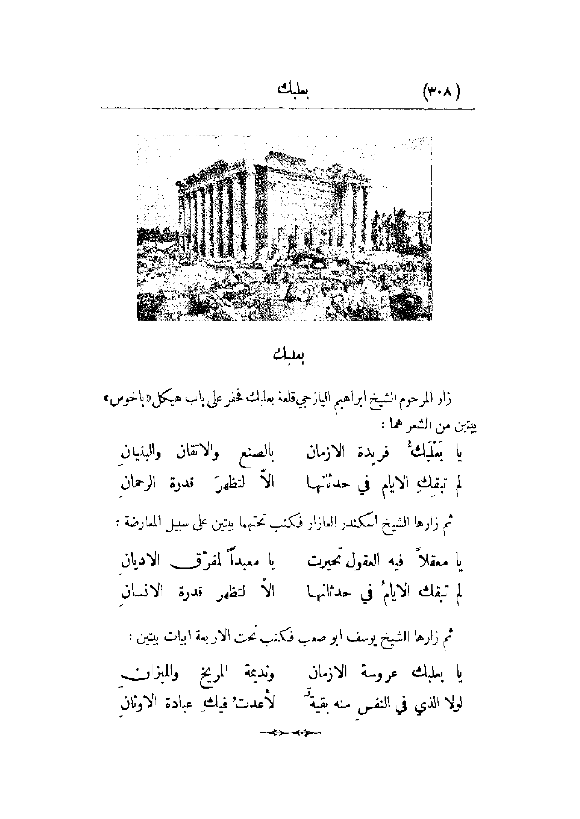 زار المرحوم الشيخ إبراهيم اليازجي قلعة بعلبك فحفر على باب هيكل باخوس بيتين من الشعر هما: