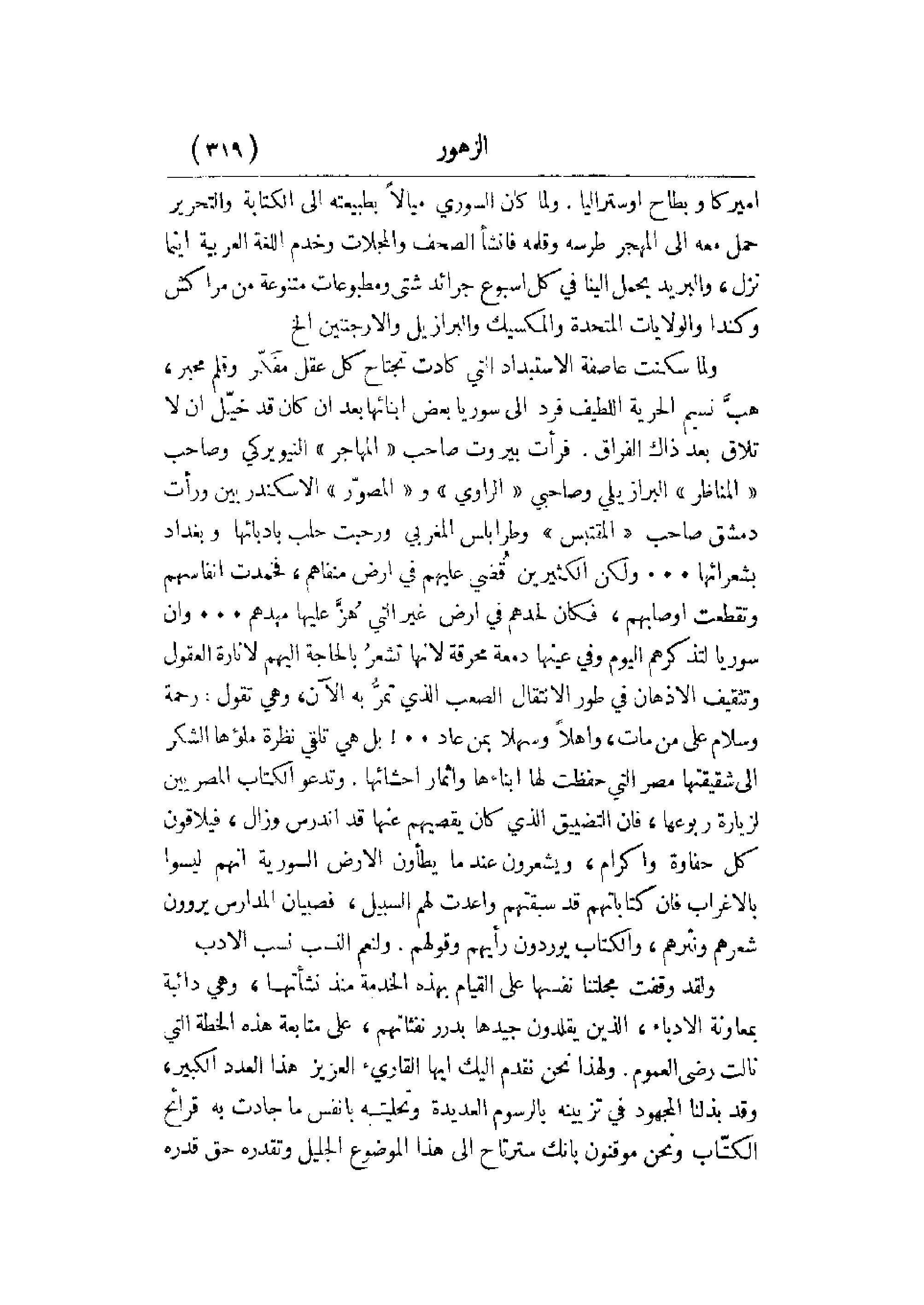 ولما سكنت عاصفة الاستبداد التي كادت تجتاح كل عقل مفكر وقلم محبر، هب نسيم الحرية اللطيف فرد إلى سورية بعض أبنائها بعد أن كان قد خيل أن لا تلاق بع ذاك الفراق. فرأت بيروت صاحب المهاجر النيويوركي وصاحب المناظر البرازيلي وصاحبي الراوي والمصور الإسكندريين ورأت دمشق صاحب المقتبس وطرابلس المغربي ورحبت حلب بأدبائها وبغداد بشعرائها. . . ولكن الكثيرين قضي عليهم في أرض منفاهم، فخمدت أنفاسهم وتقطعت أوصابهم، فكان لحدهم في أرض غير التي هز عليها مهدهم. . . وإن سورية لتذكرهم اليوم في عينها دمعة محرقة لأنها تشعر بالحاجة إليهم لإنارة العقول وتثقيف الأذهان في طور الانتقال الصعب الذي تمر به الآن، وهي تقول: رحمة وسلام على من مات، وأهلاً وسهلاً بمن عاد. . .! بل هي تلقي نظرة ملؤها الشكر إلى شقيقتها
