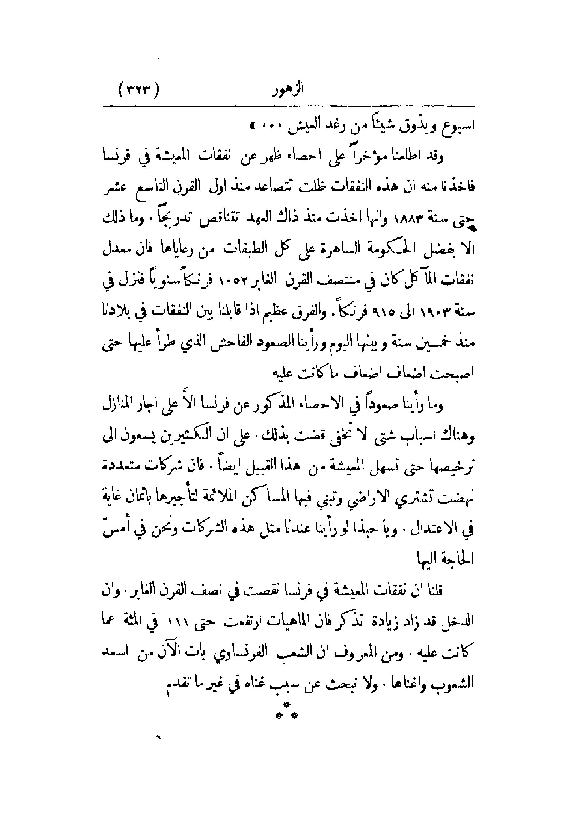 وقد أطلعنا مؤخراً على إحصاء ظهر عن نفقات المعيشة في فرنسا فأخذنا منه أن هذه النفقات ظلت تتصاعد منذ أول القرن التاسع عشر حتى سنة 1883 وأنها أخذت منذ ذاك العهد تتناقص تدريجاً. وما ذلك إلا بفضل الحكومة الساهرة على كل الطبقات من رعاياها فإن معدل نفقات المآكل كان في منتصف القرن الغابر 1052 فرنكاً سنوياً فنزل في سنة 1903 إلى 915 فرنكاً. والفرق عظيم إذا قابلنا بين النفقات في بلادنا منذ خمسين سنة وبينها اليوم ورأينا الصعود الفاحش الذي طرأ عليها حتى أصبحت أضعاف أضعاف ما كانت عليه.
