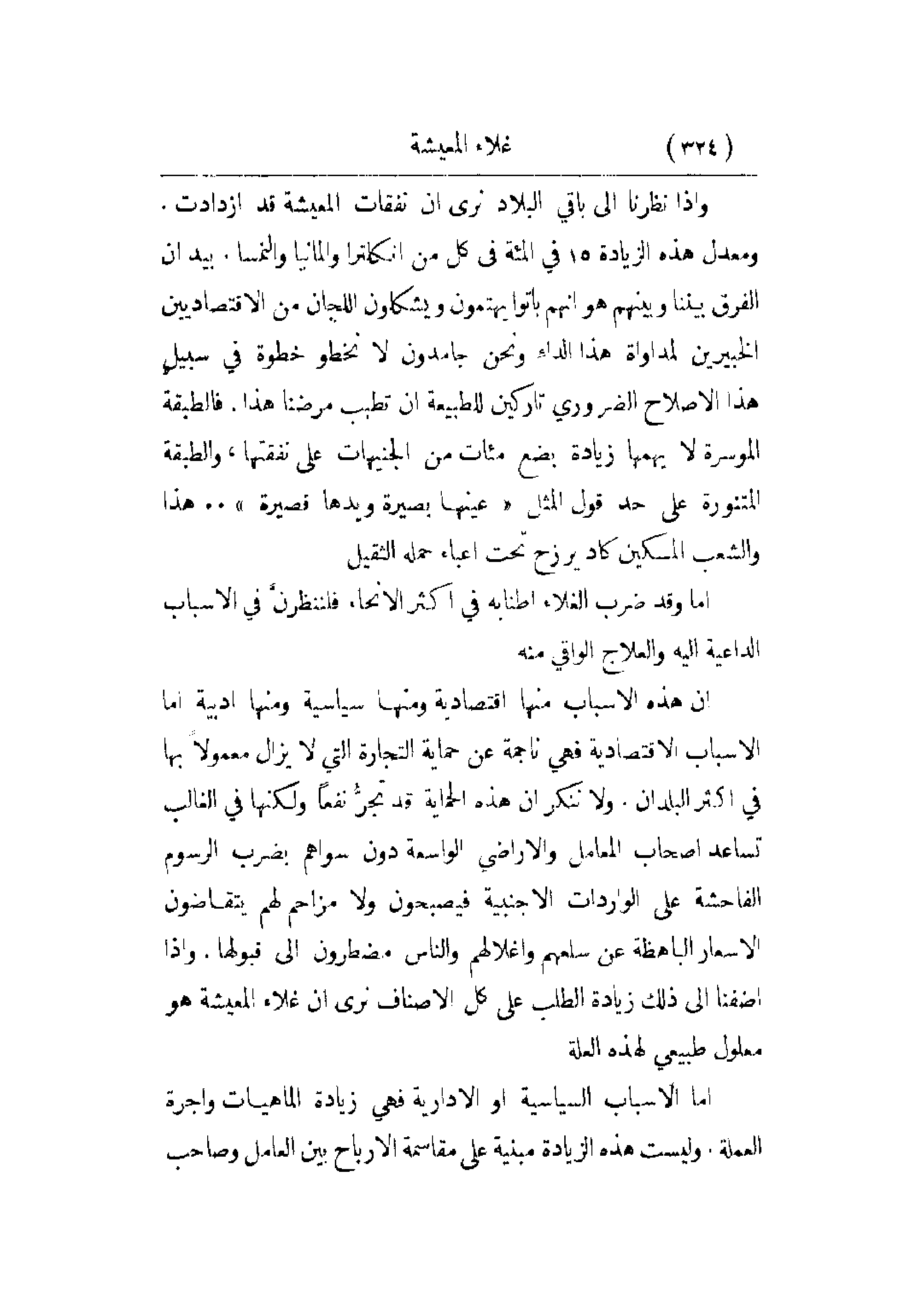 وإذا نظرنا إلى باقي البلاد نرى أن نفقات المعيشة قد ازدادت. ومعدل هذه الزيادة 15 في المئة في كل من إنكلترا وألمانيا والنمسا. بيد أن الفرق بيننا وبينهم هو أنهم باتوا يهتمون ويشكلون اللجان من الاقتصاديين الخبيرين لمداواة هذا الداء ونحن جامدون لا نخطو خطوة في سبيل هذا الإصلاح الضروري تاركين للطبيعة أن تطبب مرضنا هذا. فالطبقة الموسرة لا يهمها زيادة بضع مئات من الجنيهات على نفقتها، والطبقة المتنورة على حد قول المثل عينها بصيرة ويدها قصيرة. . . هذا والشعب المسكين يكاد يرزح تحت أعباء حمله الثقيل.