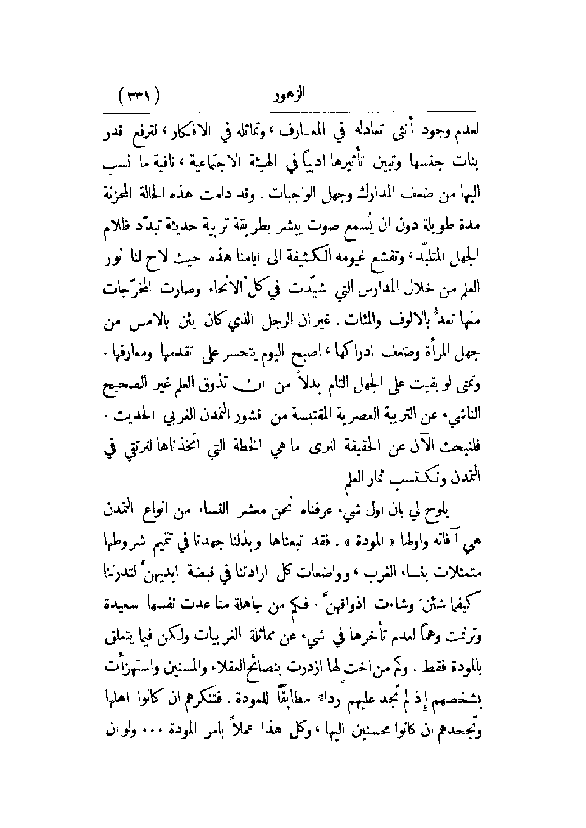 لعدم وجود أنثى تعادله في المعارف، وتماثله في الأفكار، لترفع قدر بنات جنسها وتبين تأثيرها أدبياً في الهيئة الاجتماعية، نافية ما نسب إليها من ضعف المدارك وجهل الواجبات. وقد دامت هذه الحالة المحزنة مدة طويلة دون أن يسمع صوت يبشر بطريقة تربية حديثة تبدد ظلام الجهل المتلبد. وتقشع غيومه الكثيفة إلى أيامنا هذه حيث لاح لنا نور العلم من خلال المدارس التي شيدت في كل الأنحاء وصارت المخرجات منها تعد بالألوف والمئات. غير أن الرجل الذي كان يئن بالأمس من جهل المرأة وضعف إدراكها، أصبح اليوم يتحسر على تقدمها ومعارفها. وتمنى لو بقيت على الجهل التام بدلاً من أن تذوق العلم غير الصحيح الناشئ عن التربية العصرية المقتبسة من قشور التمدن الغربي الحديث. فلنبحث الآن عن الحقيقة لنرى ما هي الخطة التي اتخذناها لنرتقي في التمدن ونكتسب ثمار العلم.