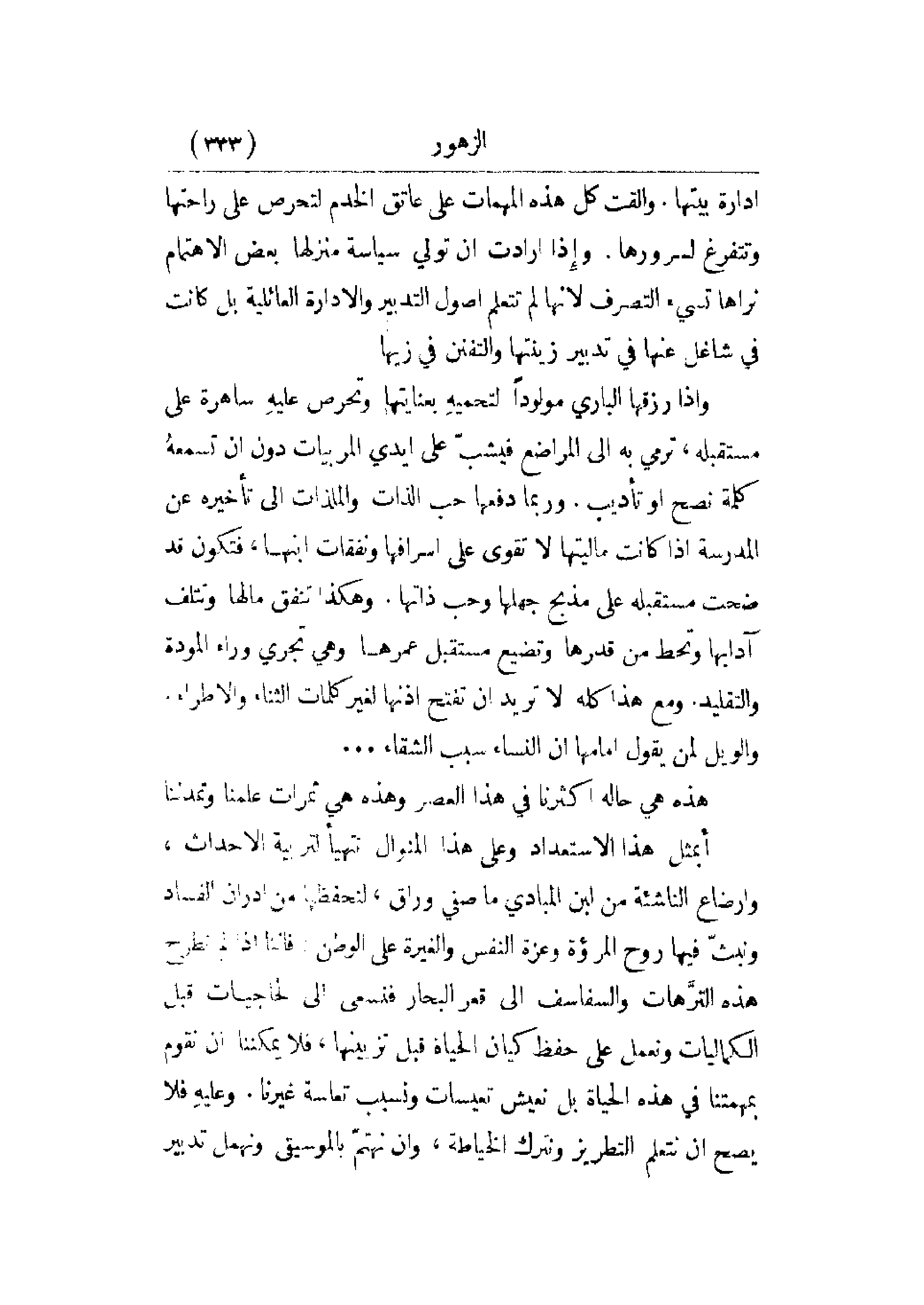 إدارة بيتها. وألقت كل هذه المهمات على عاتق الخدم لتحرص على راحتها وتتفرغ لسرورها. وإذا أرادت أن تولي سياسة منزلها بعض الاهتمام نراها تسيء التصرف لأنها لم تتعلم أصول التدبير والإدارة العائلية بل كانت في شاغل عنها في تدبير زينتها والتفنن في زيها.