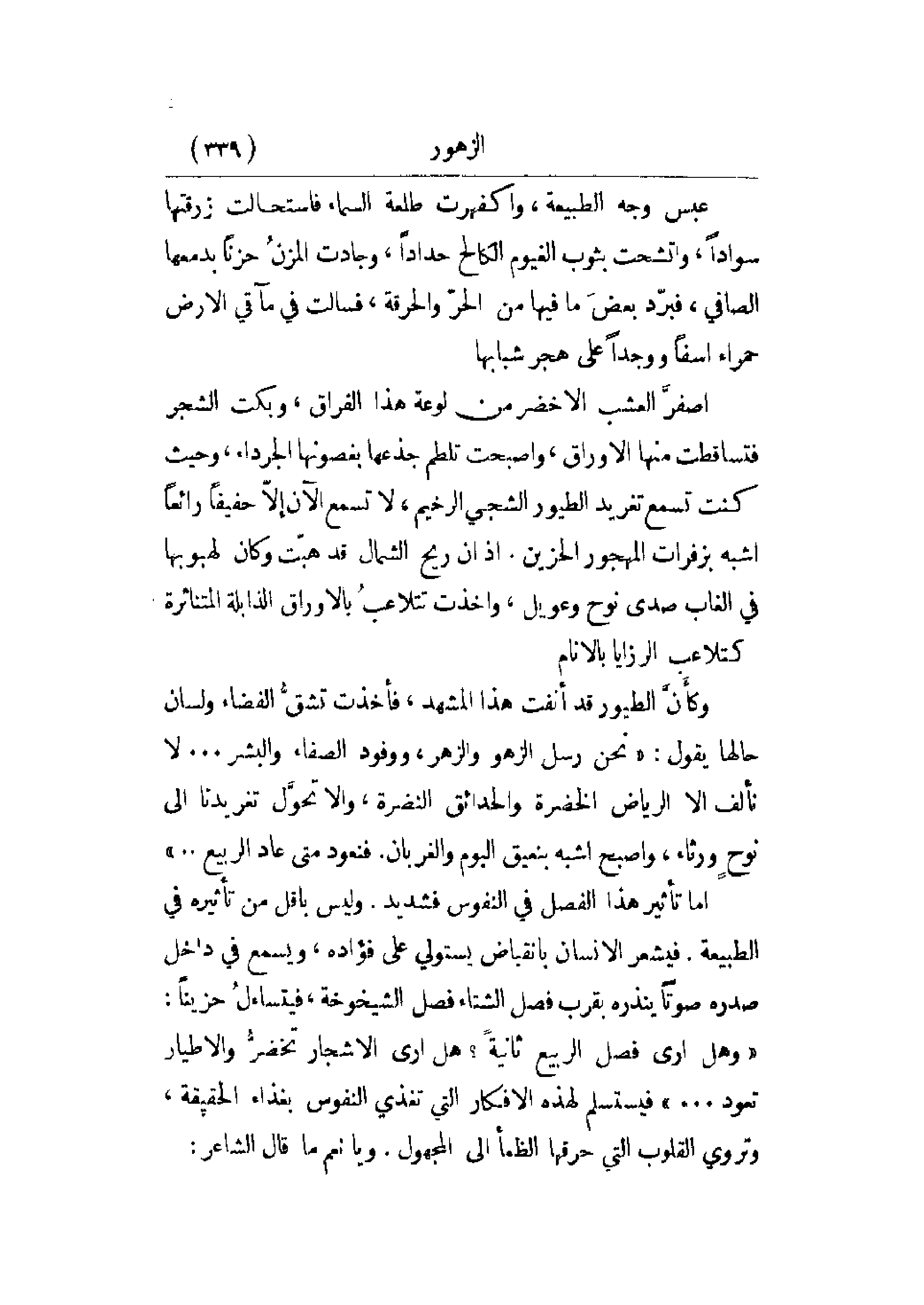 عبس وجه الطبيعة، واكفهرت طلعة السماء فاستحالت زرقتها سواداً، واتشحت بثوب الغيوم الكالح حداداً، وجادت المزن حزناً بدمعها الصافي، فبرد بعض ما فيها من الحر والحرقة، فسالت في مآقي الأرض حمراء أسفاً ووجداً على هجر شبابها.