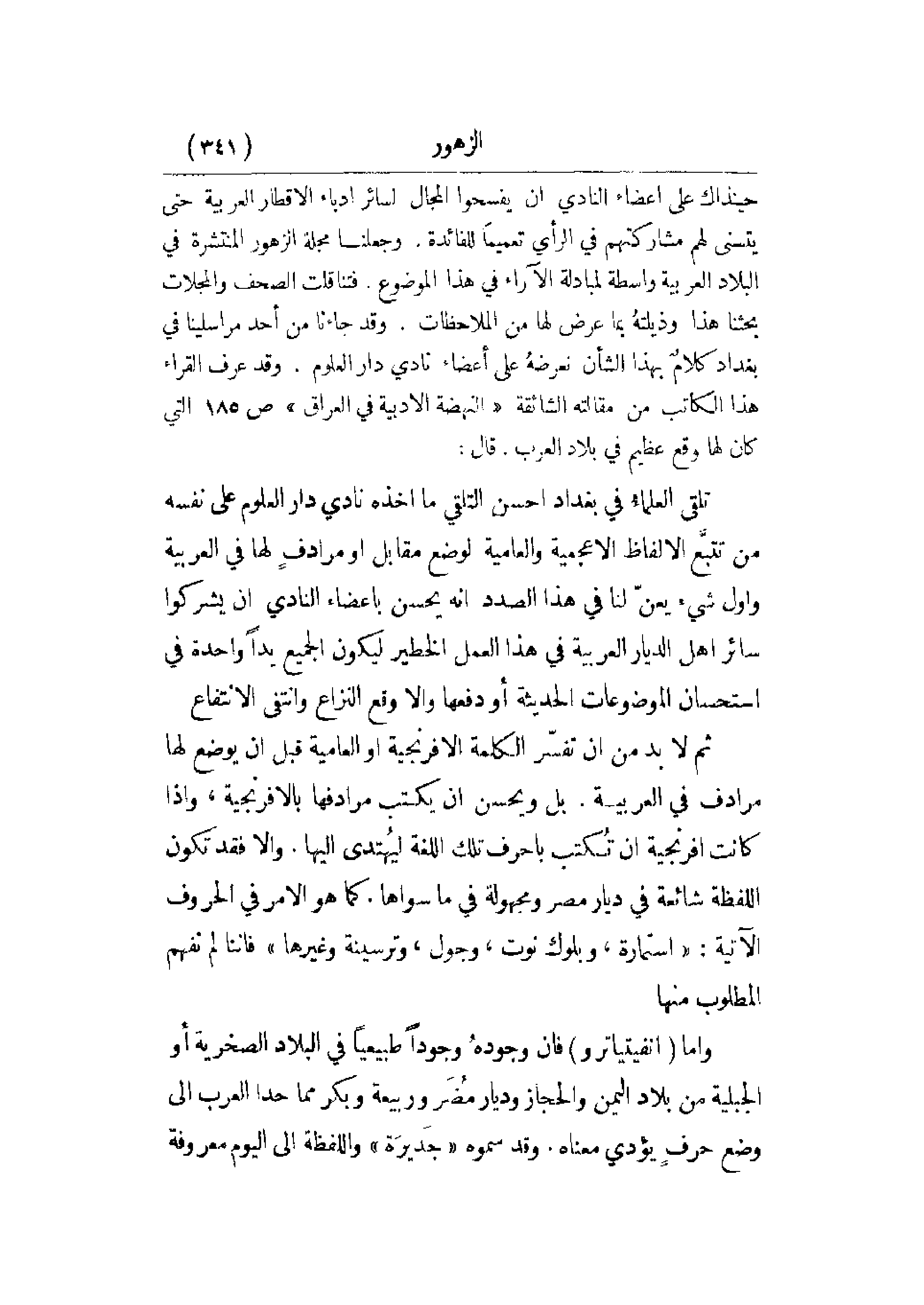 حينذاك على أعضاء النادي أن يفسحوا المجال لسائر أدباء الأقطار العربية حتى يتسنى لهم مشاركتهم في الرأي تعميماً للفائدة. وجعلنا مجلة الزهور المنتشرة في البلاد العربية واسطة لمبادلة الآراء في هذا الموضوع. فتناقلت الصحف والمجلات بحثنا هذا وذيلته بما عرض لها من الملاحظات. وقد جاءنا من أحد مراسلينا في بغداد كلام بهذا الشأن نعرضه على أعضاء نادي دار العلوم. وقد عرف القراء هذا الكاتب من مقالته الشائقة النهضة الأدبية في العراق ص 185 التي كان لها وقع عظيم في بلاد العرب. قال: