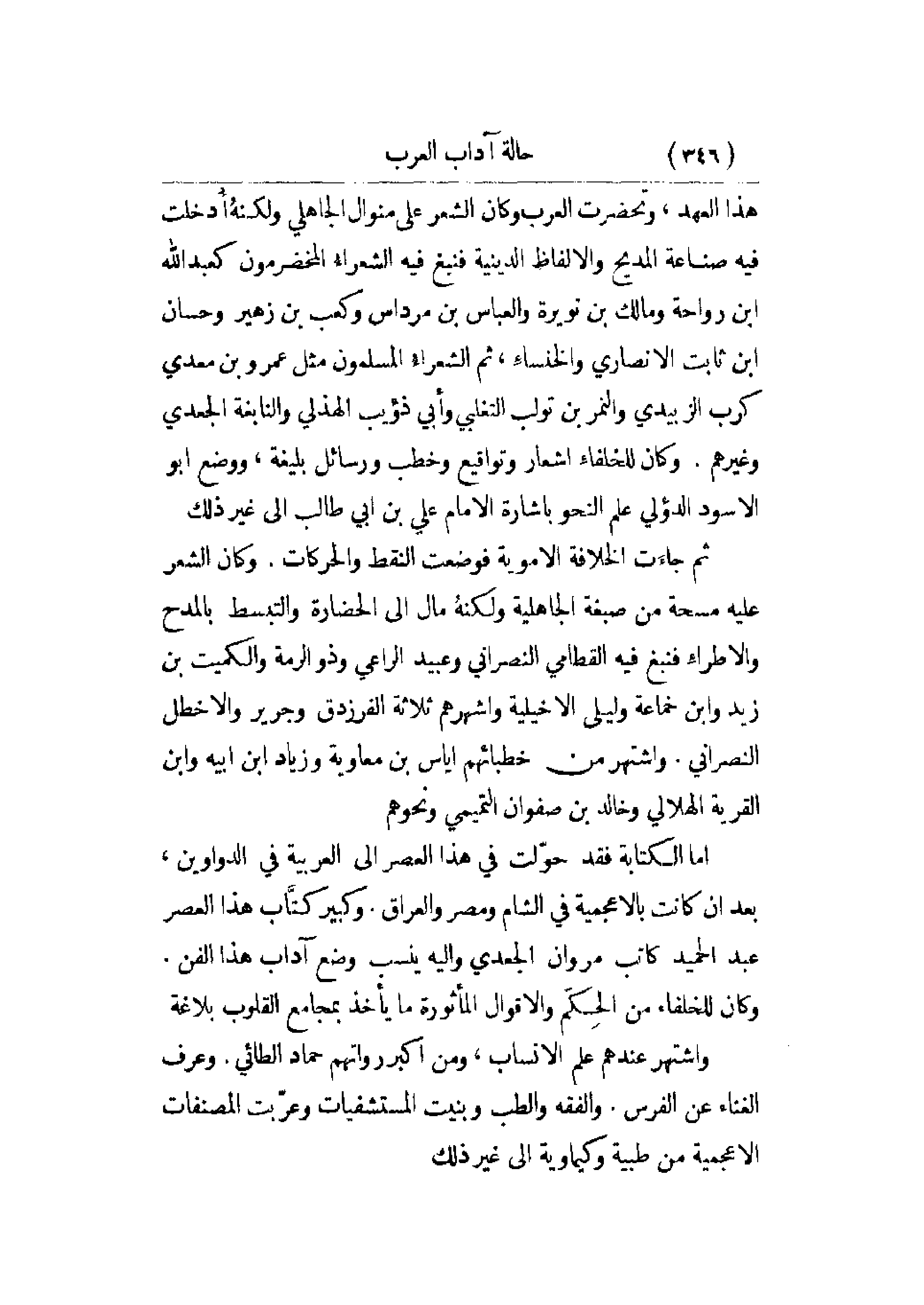 هذا العهد، وتحضرت العرب وكان الشعر على منوال الجاهلي ولكنه أدخلت فيه صناعة المديح والألفاظ الدينية فنبغ فيه الشعراء المخضرمون كعبد الله بن رواحة ومالك بن نويرة والعباس بن مرداس وكعب بن زهير وحسان بن ثابت الأنصاري والخنساء، ثم الشعراء المسلمون مثل عمرو بن معدي