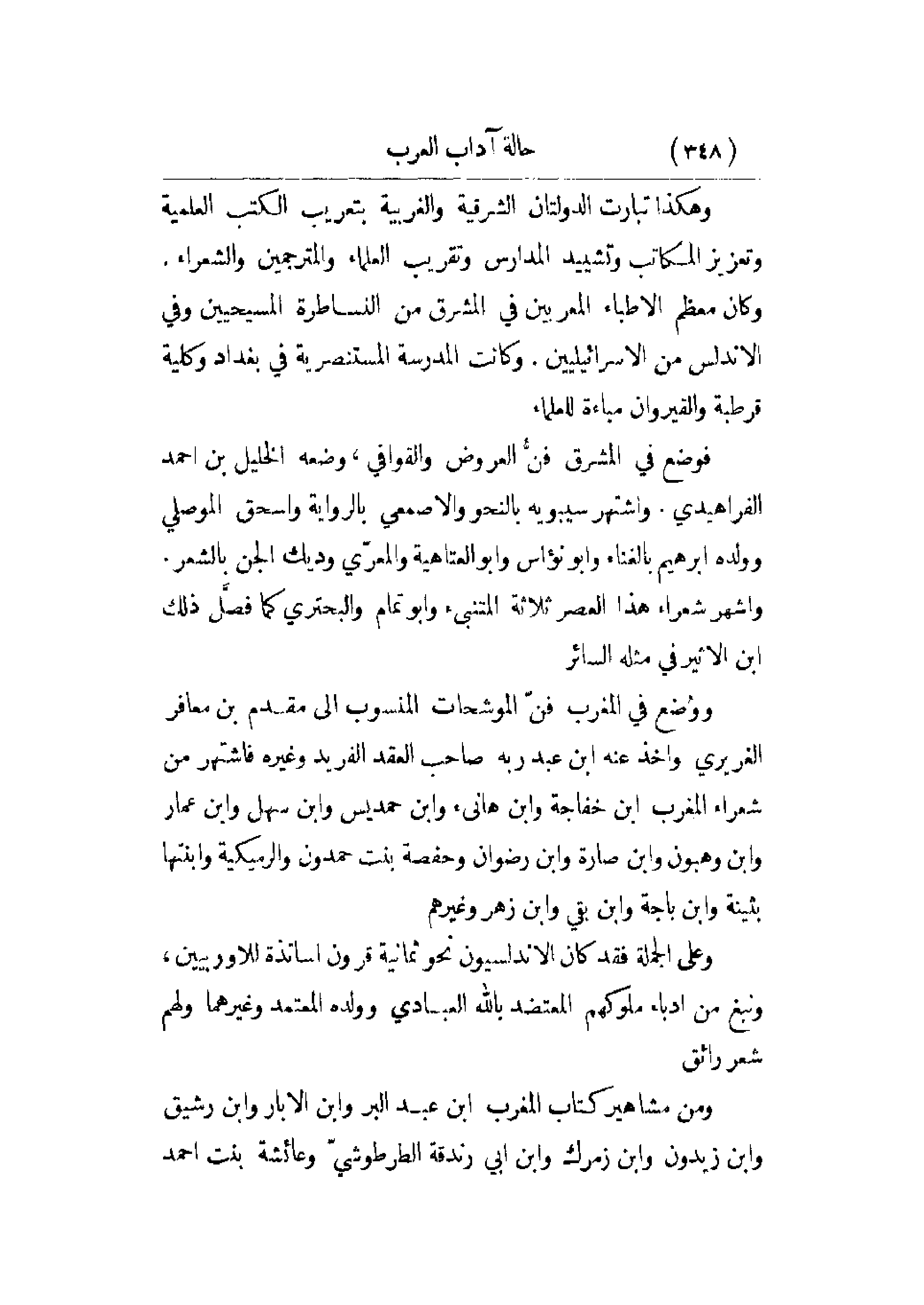 وهكذا تبارت الدولتان الشرقية والغربية بتعريب الكتب العلمية وتعزيز المكاتب وتشييد المدارس وتقريب العلماء والمترجمين والشعراء وكان معظم الأطباء المعربين في المشرق من النساطرة المسيحيين وفي الأندلس من الإسرائيليين. وكانت المدرسة المستنصرية في بغداد وكلية قرطبة والقيروان مباءة للعلماء.