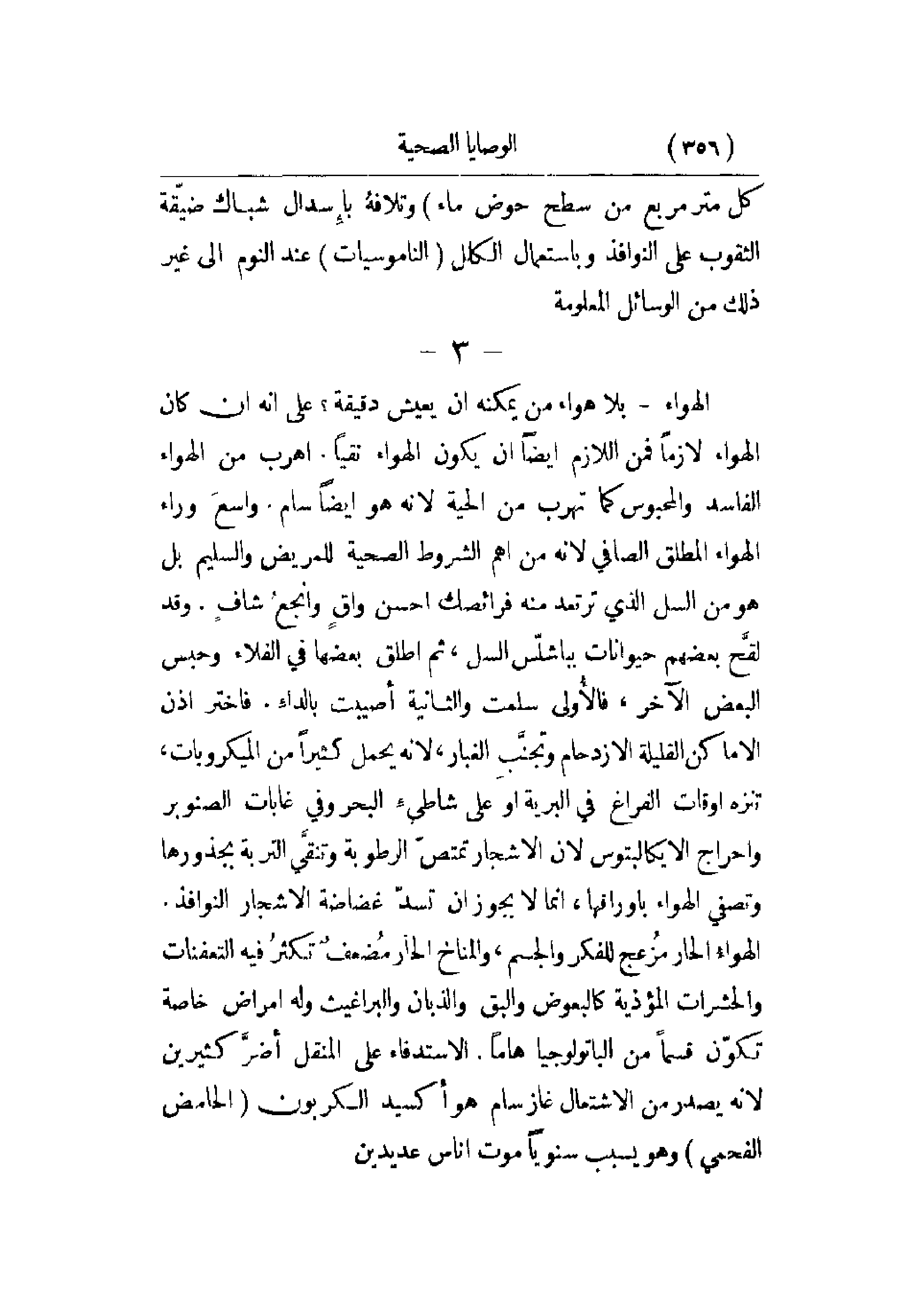 الهواء - بلا هواء من يمكنه أن يعيش دقيقة، على أنه إن كان الهواء لازماً فمن اللازم أيضاً أن يكون الهواء نقياً. أهرب من الهواء الفاسد والمحبوس كما تهرب من الحية لأنه هو أيضاً سام. . . واسعَ وراء الهواء المطلق الصافي لأنه من أهم الشروط الصحية للمريض والسليم بل هو من السل الذي ترتعد منه فرائصك أحسن واقٍ وأنجع شاف. وقد لقح بعضهم حيوانات بباشلس السل، ثم أطلق بعضها في الفلاء وحبس البعض الآخر، فالأولى سلمت والثانية أصيبت بالداء. فاختر إذن الأماكن القليلة الازدحام وتجنب الغبار، لأنه يحمل كثيراً من الميكروبات، تنزه أوقات الفراغ في البرية أو على شاطئ البحر وفي غابات الصنوبر وأحراج الإيكالبتوس لأن الأشجار تمتص الرطوبة وتنقي التربة بجذورها وتصفي الهواء بأوراقها، إنما لا يجوز أن تسد غضاضة الأشجار النوافذ. الهواء الحار مزعج للفكر والجسم، والمناخ الحار مضعف تكثر فيه التعفنات والحشرات المؤذية كالبعوض والبق والذباب والبراغيث وله أمراض خاصة تكوّن قسماً من الباتولوجيا هاماً. الاستدفاء على المنقل أضر كثيرين لأنه يصدر من الاشتعال غاز سام هو أكسيد الكربون (الحامض الفحمي) وهو يسبب سنوياً موت أناس عديدين.