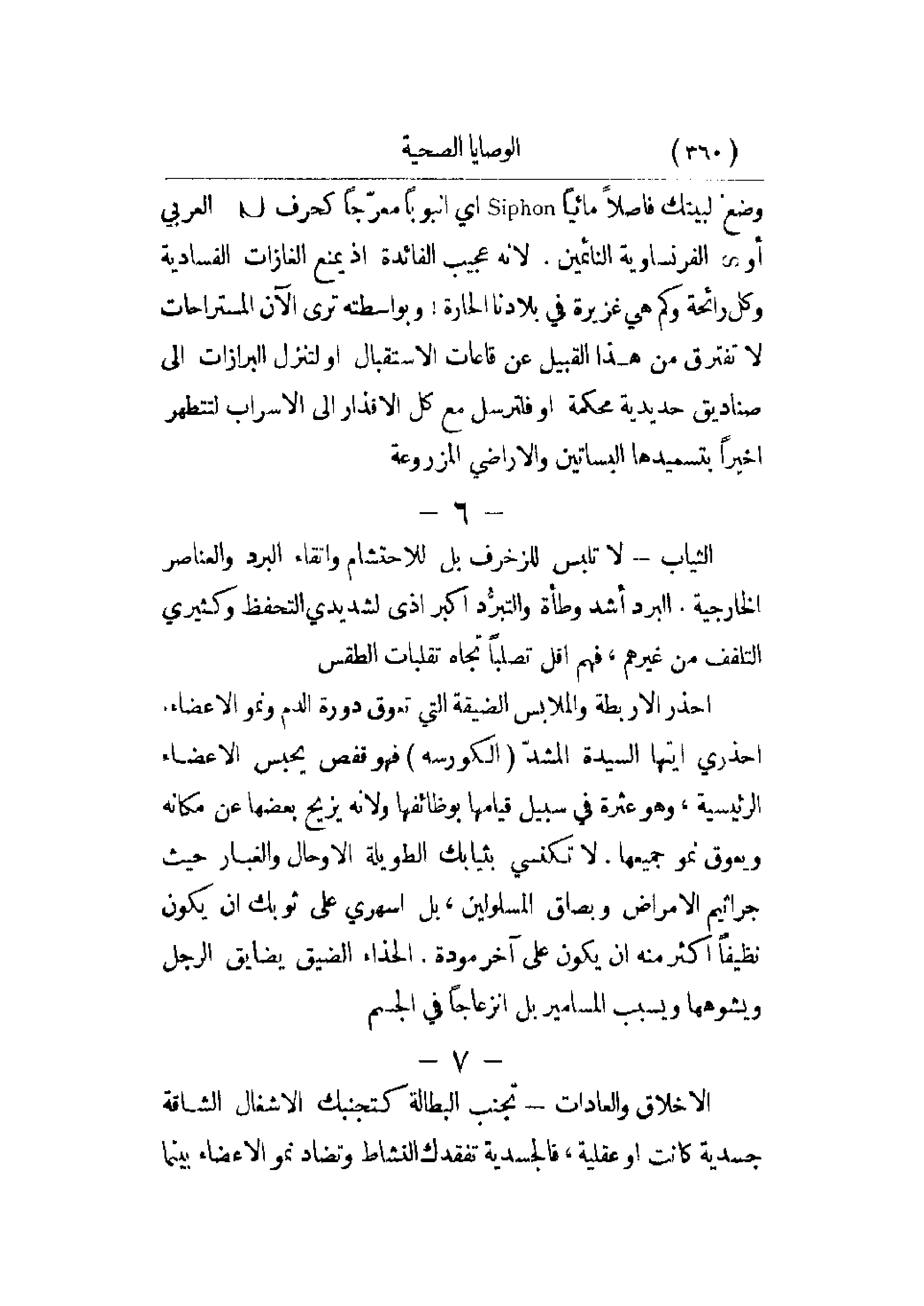وضع لبيتك فاصلاً مائياً أي أنبوباً معرجاً كحرف؟؟ العربي أو؟؟ الفرنساوية النائمين. لأنه عجيب الفائدة إذ يمنع الغازات الفاسدة وكل رائحة وكم هي غزيرة في بلادنا الحارة! وبواسطته ترى الآن المستراحات لا تفترق من هذا القبيل عن قاعات الاستقبال أو لتنزل البرازات إلى صناديق حديدية محكمة أو فلترسل مع كل الأقذار إلى الأسراب لتتطهر أخيراً بتسميدها البساتين والأراضي المزروعة.