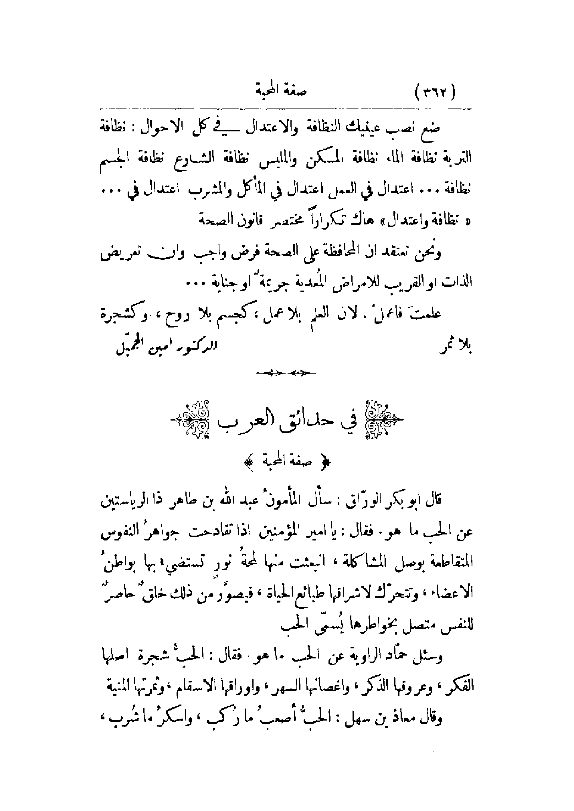قال أبو بكر الوراق: سأل المأمون عبد الله بن طاهر ذا الرياستين عن الحب ما هو. فقال: يا أمير المؤمنين إذا تقادحت جواه النفوس المتقاطعة بوصل المشاكلة، انبعثت منها لمحة نور تستضيء بها بواطن الأعضاء، وتتحرك لأشرافها طبائع الحياة، فيصور من ذلك خلق حاصر للنفس متصل بخواطرها يسمى الحب.