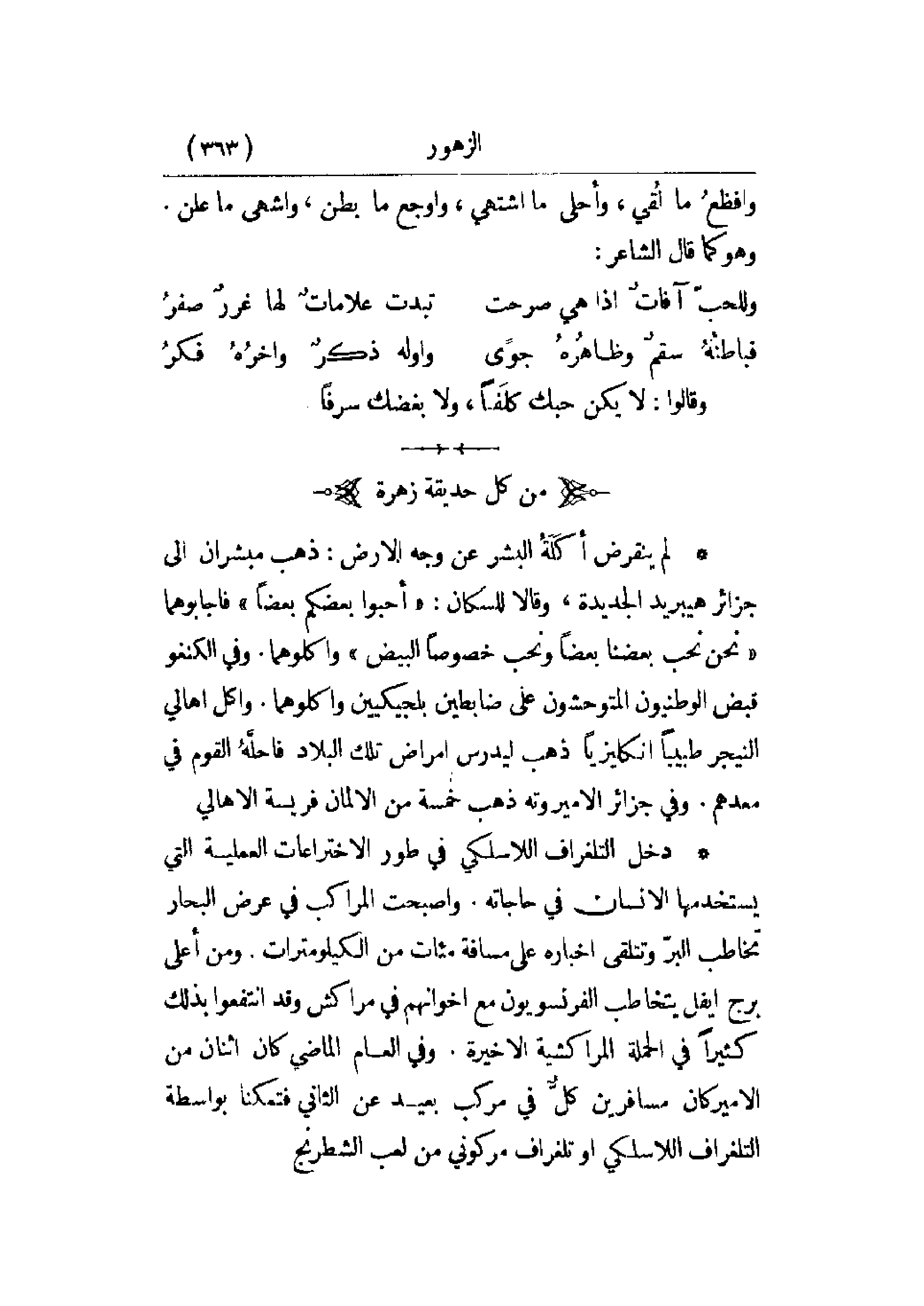 * دخل التلغراف اللاسلكي في طور الاختراعات العلمية التي يستخدمها الإنسان في حاجاته. وأصبحت المراكب في عرض البحار تخاطب البر وتتلقى أخباره على مسافة مئات من الكيلومترات. ومن أعلى برج إيفل يتخاطب الفرنسيون مع إخوانهم في مراكش وقد انتفعوا بذلك كثيراً في الحملة المراكشية الأخيرة. وفي العام الماضي كان اثنان من الأمريكان مسافرين كل في مركب بعيد عن الثاني فتكمنا بواسطة التلغراف اللاسلكي أو تلغراف مركوني من لعب الشطرنج.