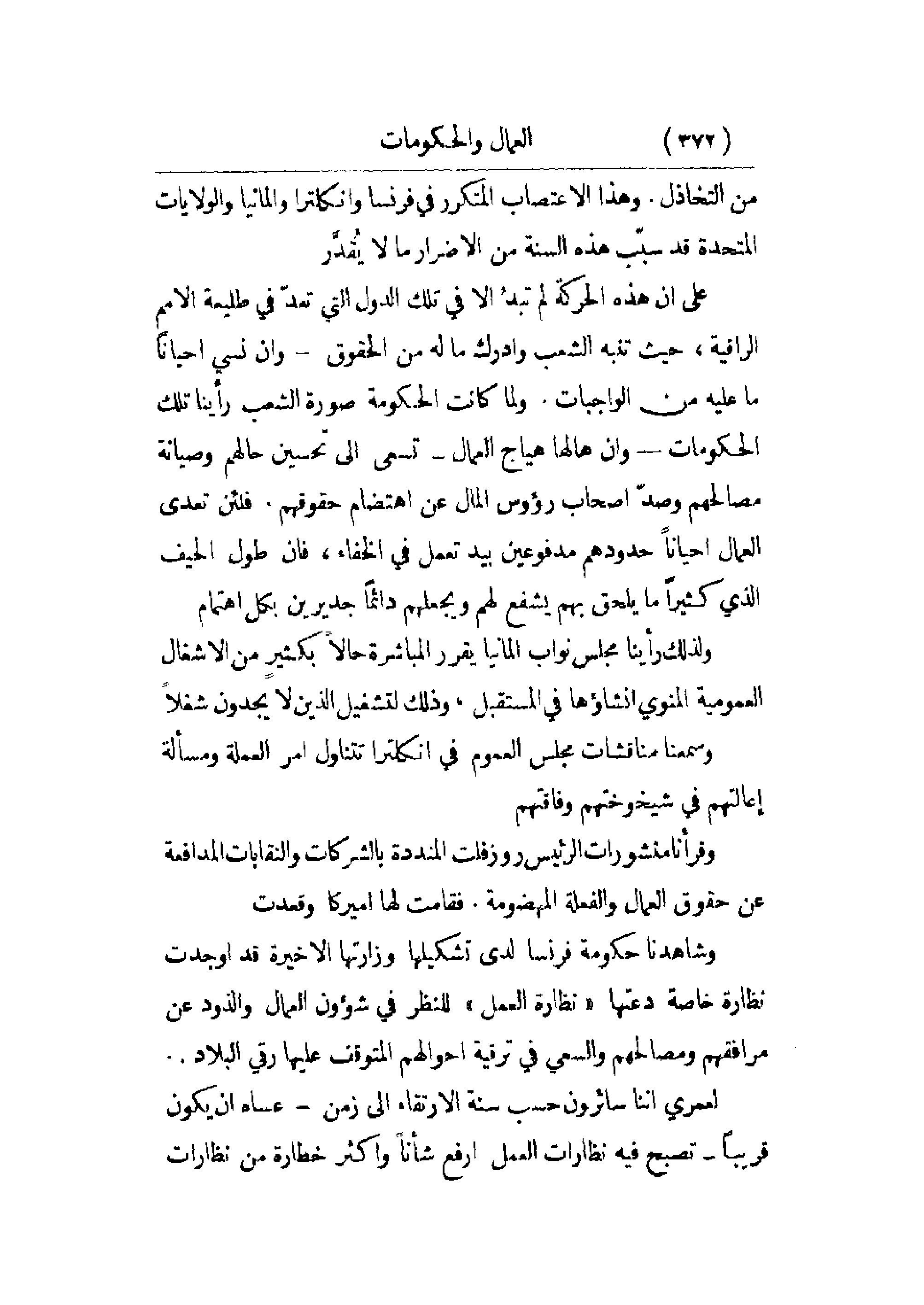 على أن هذه الحركة لم تبد إلا في تلك الدول التي تعد في طليعة الأمم الراقية، حيث تنبه الشعب وأدرك ما له من الحقوق - وإن نسي أحياناً ما عليه من الواجبات. ولما كانت الحكومة صورة الشعب رأينا تلك الحكومات - وإن هالها هياج العمال - تسعى إلى تحسين حالهم وصيانة مصالحهم وصد أصحاب رؤوس المال عن اهتضام حقوقهم. فلئن تعدى العمال أحياناً حدودهم مدفوعين بيد تعمل في الخفاء، فإن طول الحيف الذي كثيراً ما يلحق