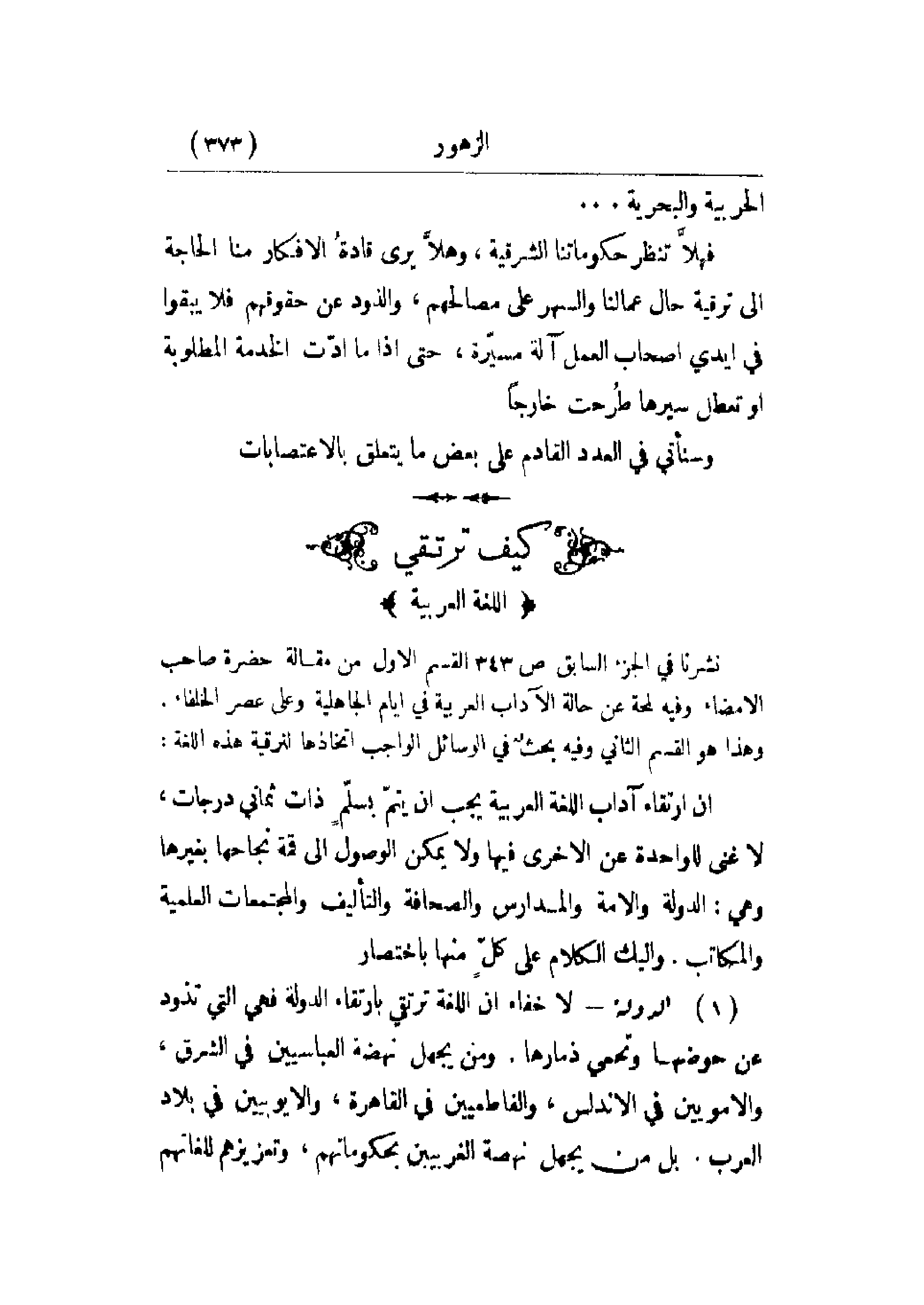 إن ارتقاء آداب اللغة العربية يجب أن يتم بسلم ذات ثماني درجات، لا غنى للواحدة عن الأخرى فيها ولا يمكن الوصل إلى قمة نجاحها بغيرها وهي: الدولة والأمة والمدارس والصحافة والتأليف والمجتمعات العلمية والمكاتب. وإليك الكلام على كل منها باختصار.
