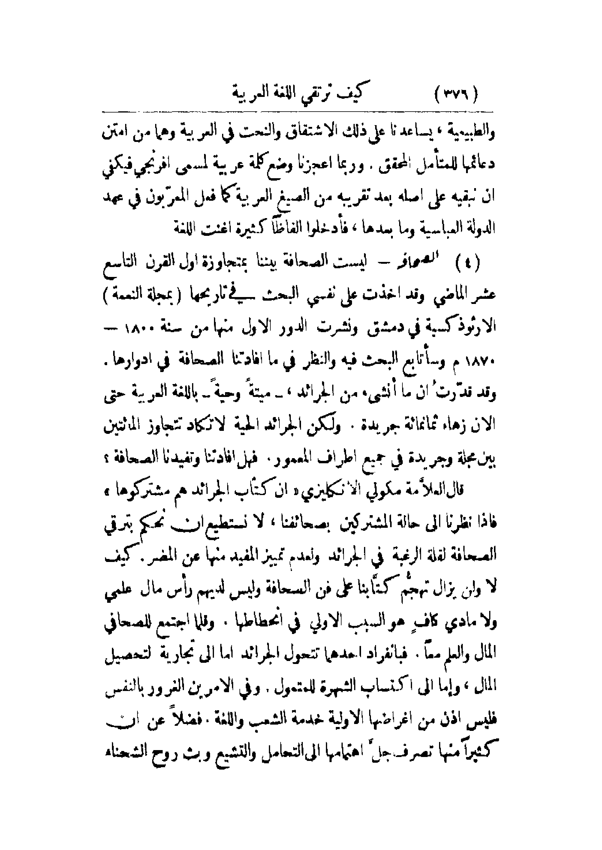 أخذت على نفسي البحث في تاريخها (بمجلة النعمة) الأرثوذكسية في دمشق ونشرت الدور الأول منها من سنة 1800 - 1870 م وسأتابع البحث فيه والنظر في ما أفادتنا الصحافة في أدوارها. وقد قدرت أن ما أنشئ من الجرائد، - ميتة وحية - باللغة العربية حتى الآن زهاء ثمانمائة جريدة. ولكن الجرائد الحية لا تكاد تتجاوز المائتين بين مجلة وجريدة في جميع أطراف المعمور. فهل أفادتنا وتفيدنا الصحافة؟