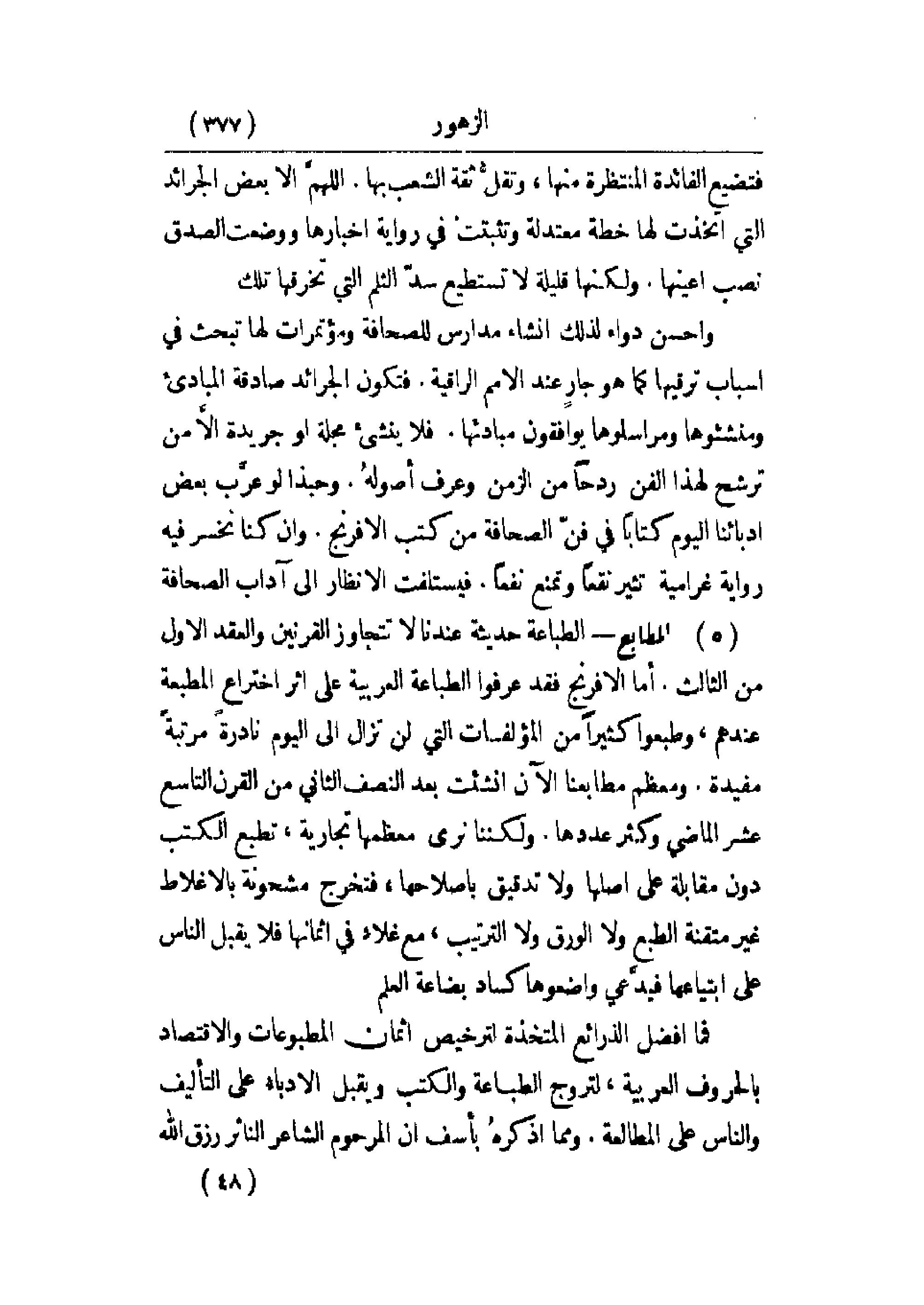 فما أفضل الذرائع المتخذة لترخيص أثمان المطبوعات والاقتصاد بالحروف العربية، لتروج الطباعة والكتب ويقبل الأدباء على التأليف والناس على المطالعة. ومما أذكره بأسف أن المرحوم الشاعر الناثر رزق الله
