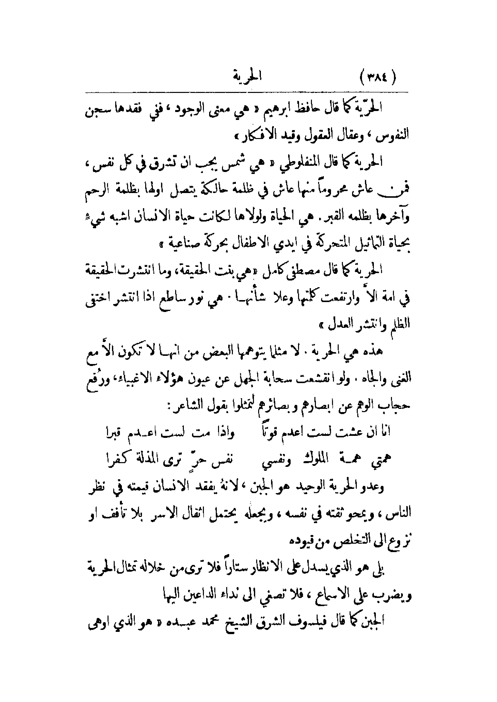 الحرية كما قال المنفلوطي: هي شمس يجب أن تشرق في كل نفس، فمن عاش محروماً منها عاش في ظلمة حالكة يتصل أولها بظلمة الرحم وآخرها بظلمة القبر. هي الحياة ولولاها لكانت حياة الإنسان أشبه شيء بحياة التماثيل المتحركة في أيدي الأطفال بحركة صناعية.