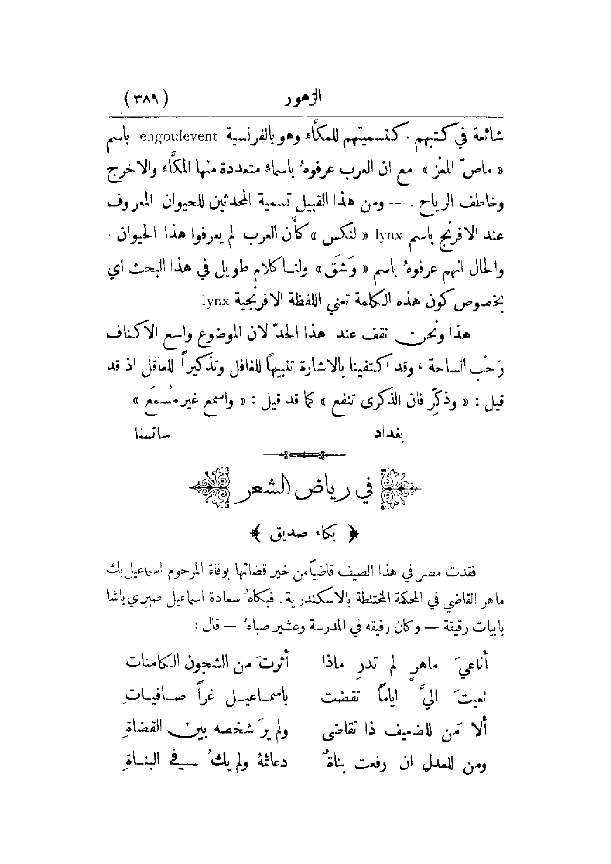 شائعة في كتبهم. كتسميتهم للمكاء وهو بالفرنسية باسم ماص المعز مع أن العرب عفوه بأسماء متعددة منها المكاء والخرج وخاطف الرياح. - ومن هذا القبيل تسمية المحدثين للحيوان المعروف عند الإفرنج باسم لنكس كأن العرب لم يعرفوا هذا الحيوان. والحال أنهم عرفوه باسم وشق ولنا كلام طويل في هذا البحث أي بخصوص كون هذه الكلمة تعني اللفظة الإفرنجية