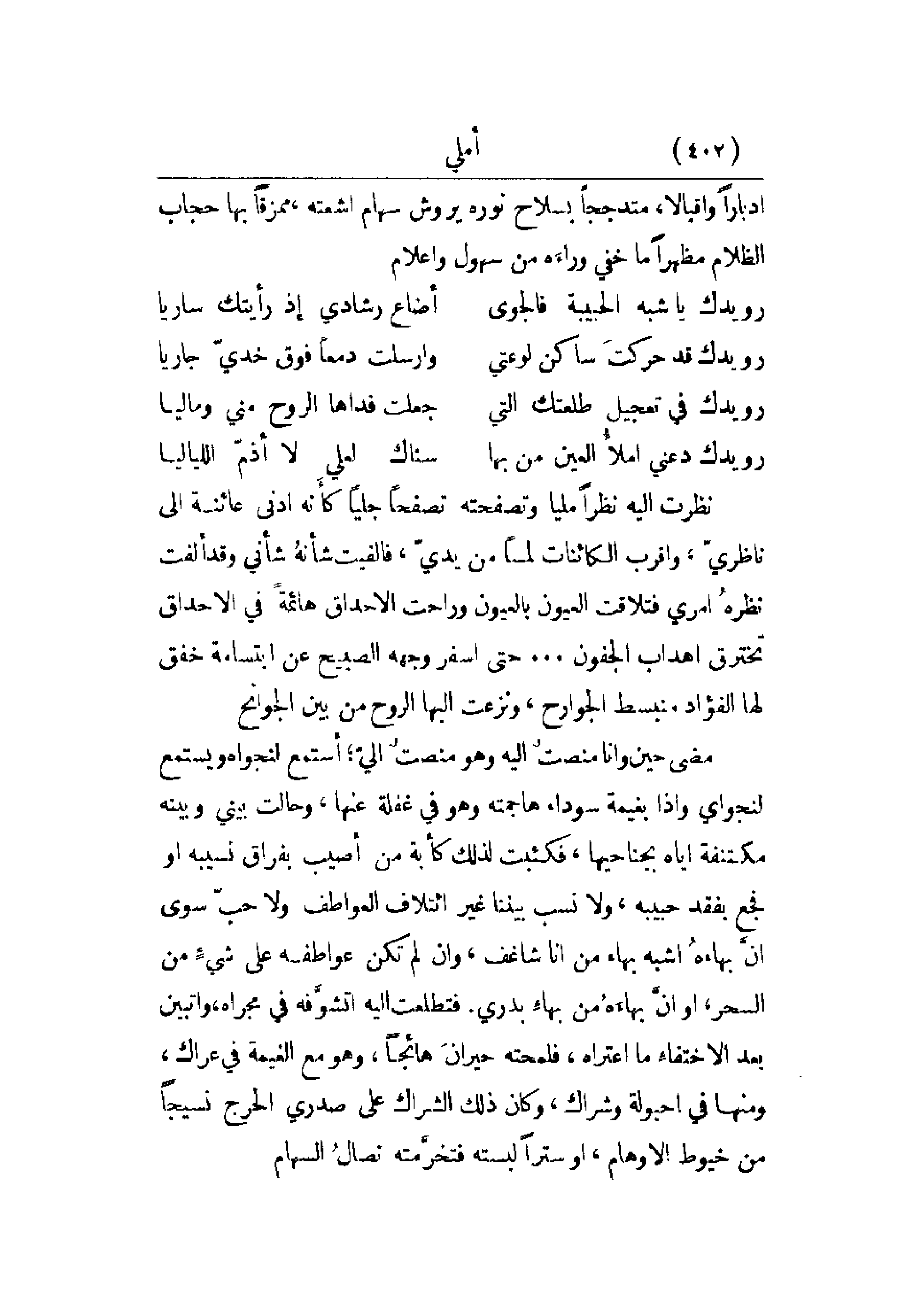 نظرت إليه نظراً ملياً وتصفحته تصفحاً جلياً كأنه أدنى عائنة إلى ناظري، وأقرب الكائنات لمساً من يدي، فالفيت شأنه شأني وقد ألفت نظره أمري فتلاقت العيون بالعيون وراحت الأحداق هائمة في الأحداق تخترق أهداب الجفون. . . حتى أسفر وجهه الصبيح عن ابتسامة خفق لها الفؤاد منبسط الجوارح، ونزعت إليها الروح من بني الجوانح.