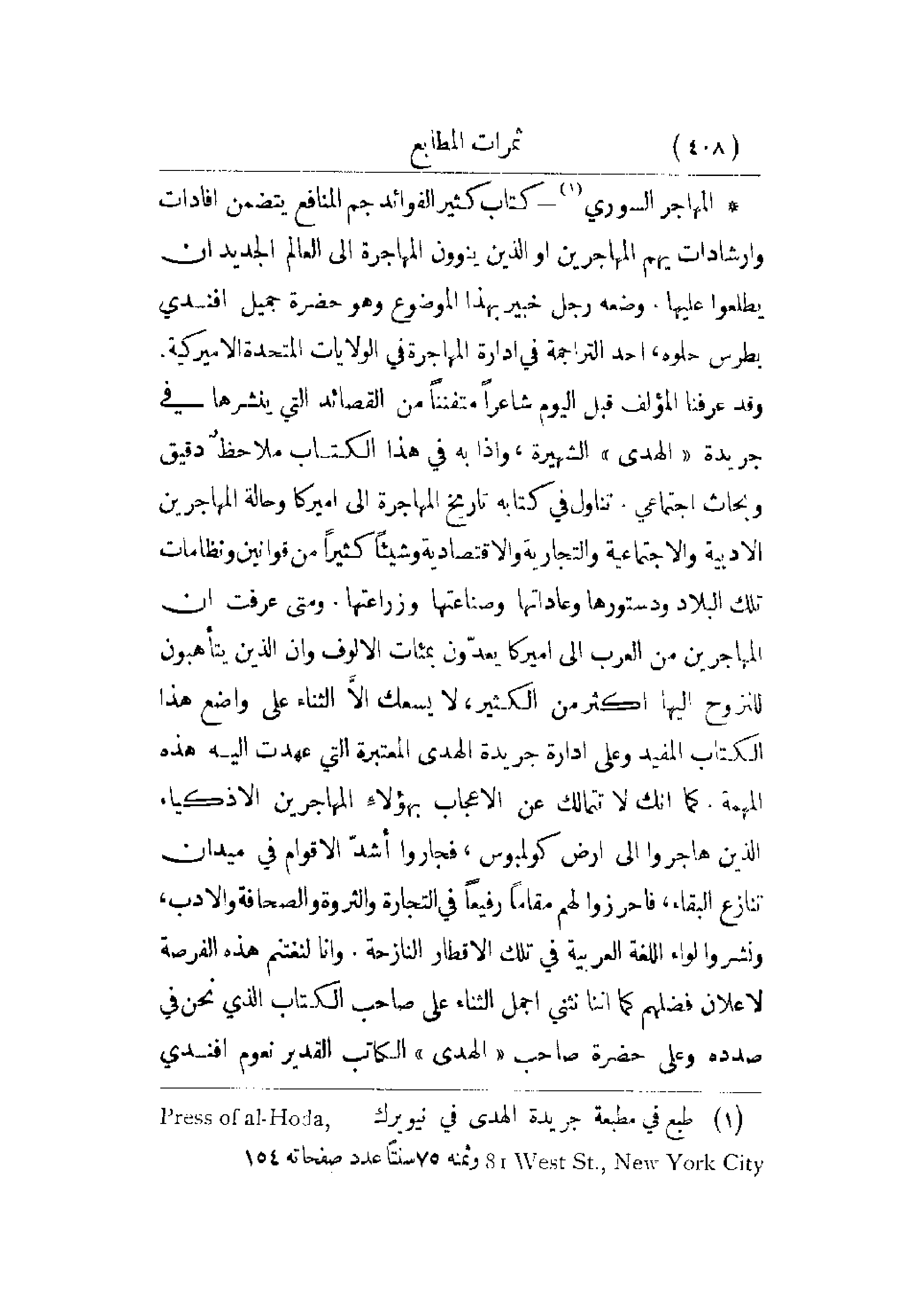 الذين يتأهبون للنزوح إليها أكثر من الكثير، لا يسعك إلا الثناء على واضع هذا الكتاب المفيد وعلى إدارة جريدة الهدى المعتبرة التي عهدت إليه هذه المهمة. كما انك لا تتمالك عن الإعجاب بهؤلاء المهاجرين الأذكياء الذين هاجروا إلى أرض كولومبوس، فجاروا أشد الأقوام في ميدان تنازع البقاء، فأحرزوا لهم مقاماً رفيعاً في التجارة والثروة والصحافة والأدب، ونشروا لواء اللغة العربية في تلك الأقطار النازحة، وإنا لنغتنم هذه الفرصة لإعلان فضلهم كما أننا نثني أجمل الثناء على صاحب الكتاب الذي نحن في صدده وعلى حضرة صاحب الهدى الكاتب القدير نعوم أفندي