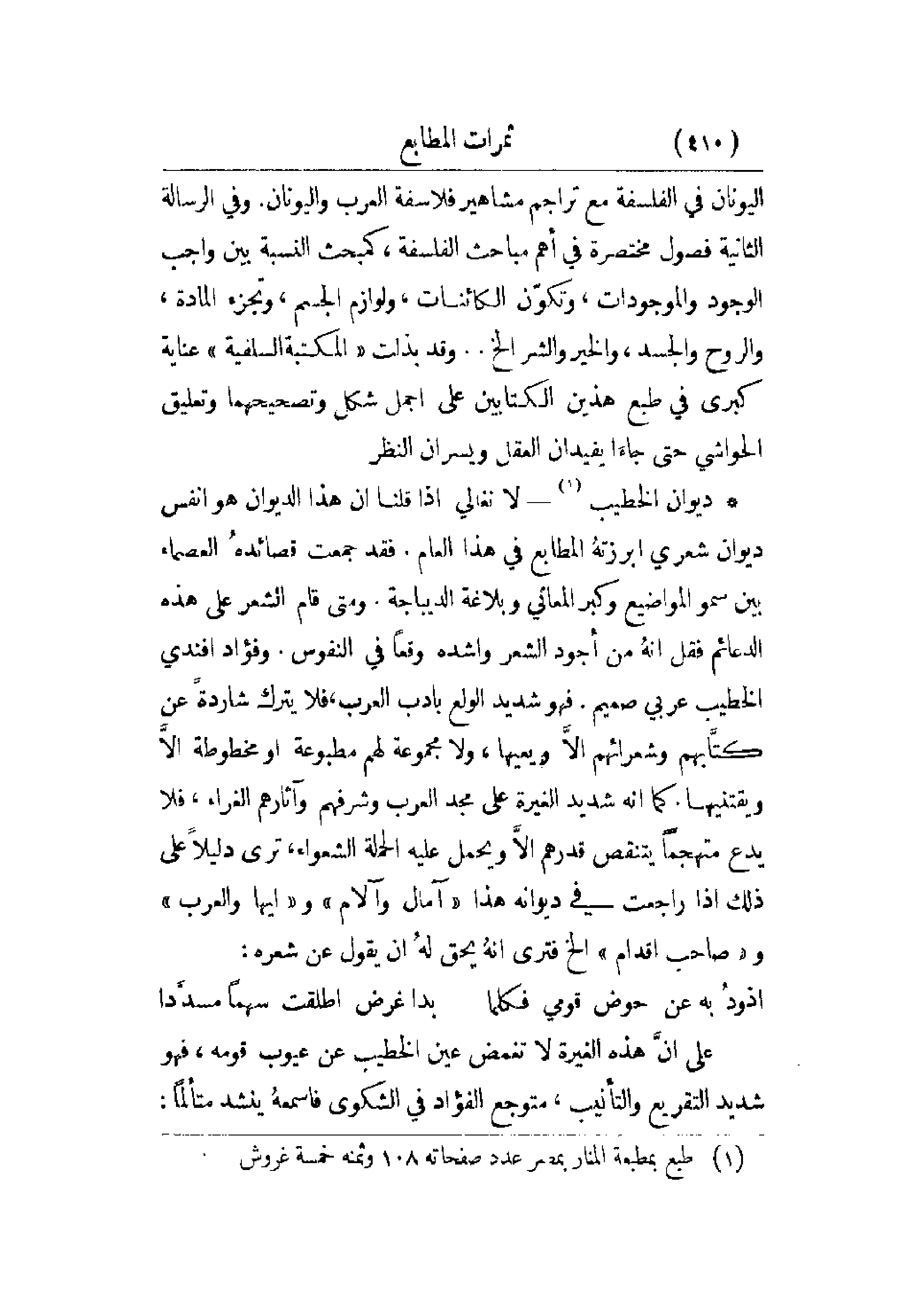 * ديوان الخطيب - لا نغالي إذا قلنا إن هذا الديوان هو أنفس ديوان شعري أبرزته المطابع في هذا العام. فقد جمعت قصائده العصماء بين سمو المواضيع وكبر المعاني وبلاغة الديباجة. ومتى قام الشعر على هذه الدعائم فقل إنه من أجود الشعر وأشده وقعاً في النفوس. وفؤاد أفندي الخطيب عربي صميم. فهو شديد الولع بأدب العرب، فلا يترك شاردة عن كتابهم وشعرائهم إلا ويعيها، ولا مجموعة لهم مطبوعة أو مخطوطة إلا ويقتنيها. كما أنه شديد الغيرة على مجد العرب وشرفهم وآثارهم الغراء، فلا يدع متجهماً ينتقص قدرهم إلا ويحمل عليه الحملة الشعواء، ترى دليلاً على ذلك إذا راجعت في ديوانه هذا آمال وآلام وأيها العرب وصاحب إقدام إلخ فترى أنه يحق له أن يقول عن شعره: