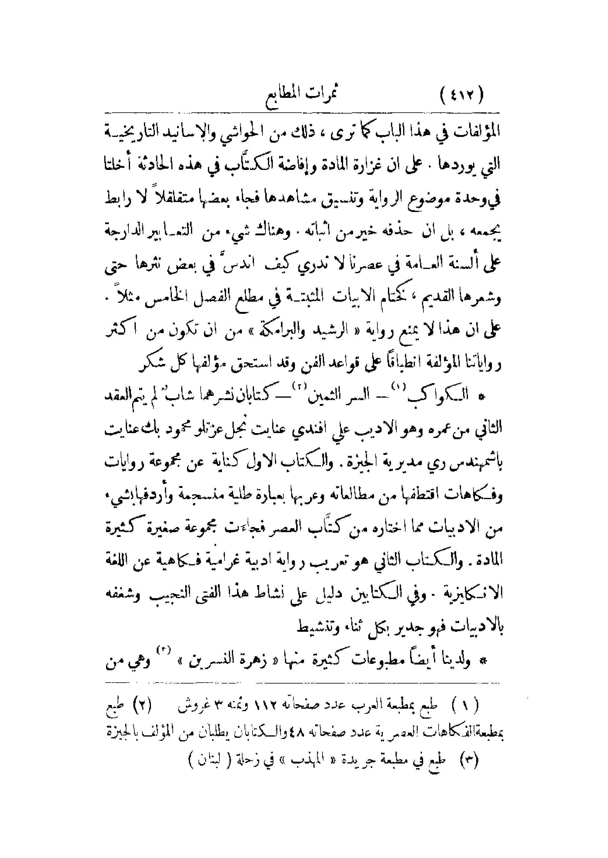 المؤلفات في هذا الباب كما ترى، ذلك من الحواشي والأسانيد التاريخية التي يوردها. على أن غزارة المادة وإفاضة الكتاب في هذه الحادثة أخلنا في وحدة موضوع الرواية وتنسيق مشاهدها فجاء بعضها متقلقلاً لا رابط يجمعه، بل أن حذفه خير من إثباته. وهناك شيء من التعابير الدارجة على ألسنة العامة في عصرنا لا ندري كيف اندس في بعض نثرها حتى وشعرها القديم، كختام الأبيات المثبتة في مطلع الفصل الخامس مثلاً. على أن هذا لا يمنع رواية الرشيد والبرامكة من أن تكون من أكثر رواياتنا المؤلفة انطباقاً على قواعد الفن وقد استحق مؤلفها كل شكر.