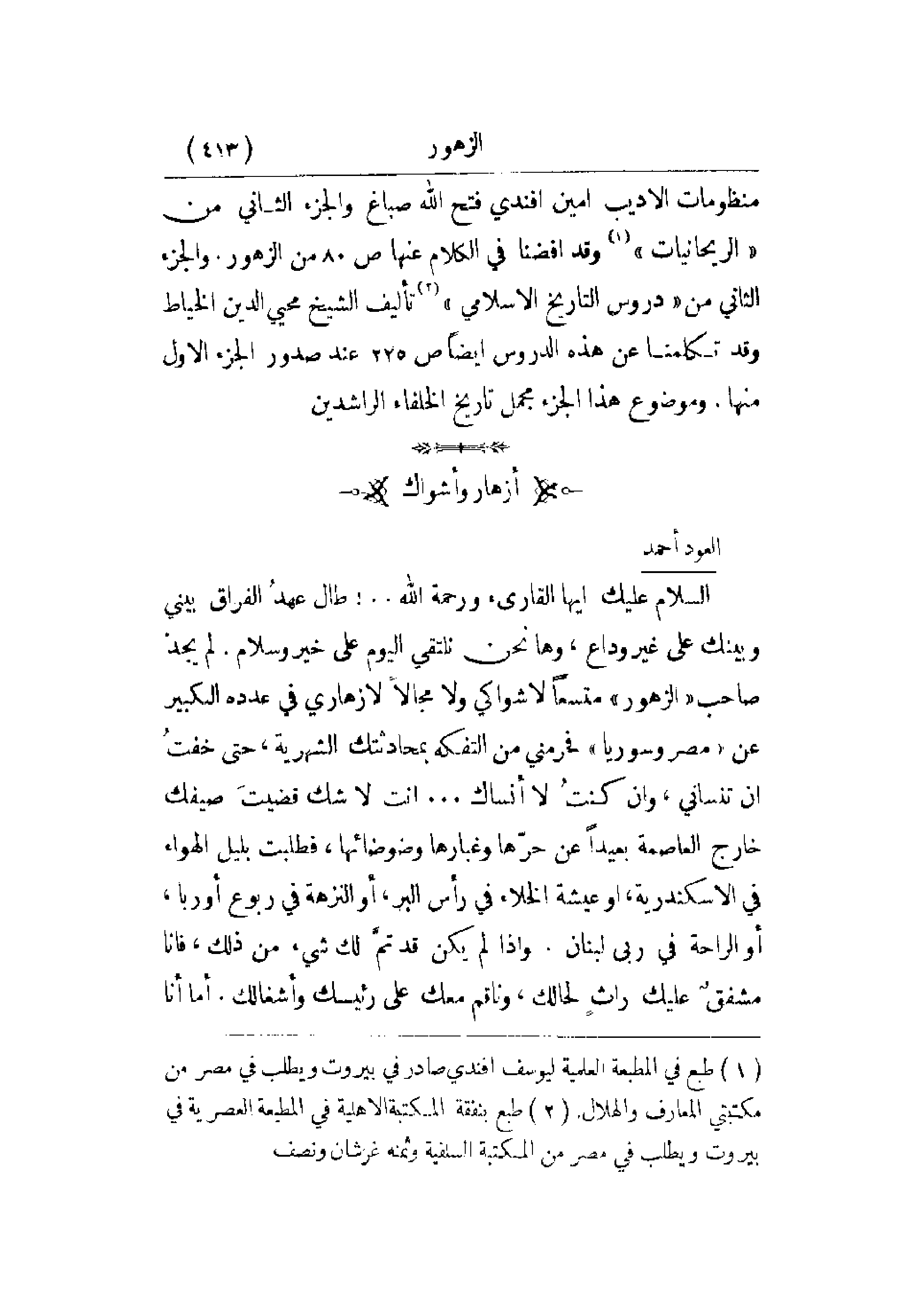 منظومات الأديب أمين أفندي فتح الله صباغ والجزء الثاني من الريحانيات وقد أفضنا في الكلام عنها ص 80 من الزهور والجزء الثاني من دروس التاريخ الإسلامي تأليف الشيخ محيي الدين الخياط وقد تكلمنا عن هذه الدروس أيضاً ص 225 عند صدور الجزء الأول منها. وموضوع هذا الجزء مجمل تاريخ الخلفاء الراشدين.