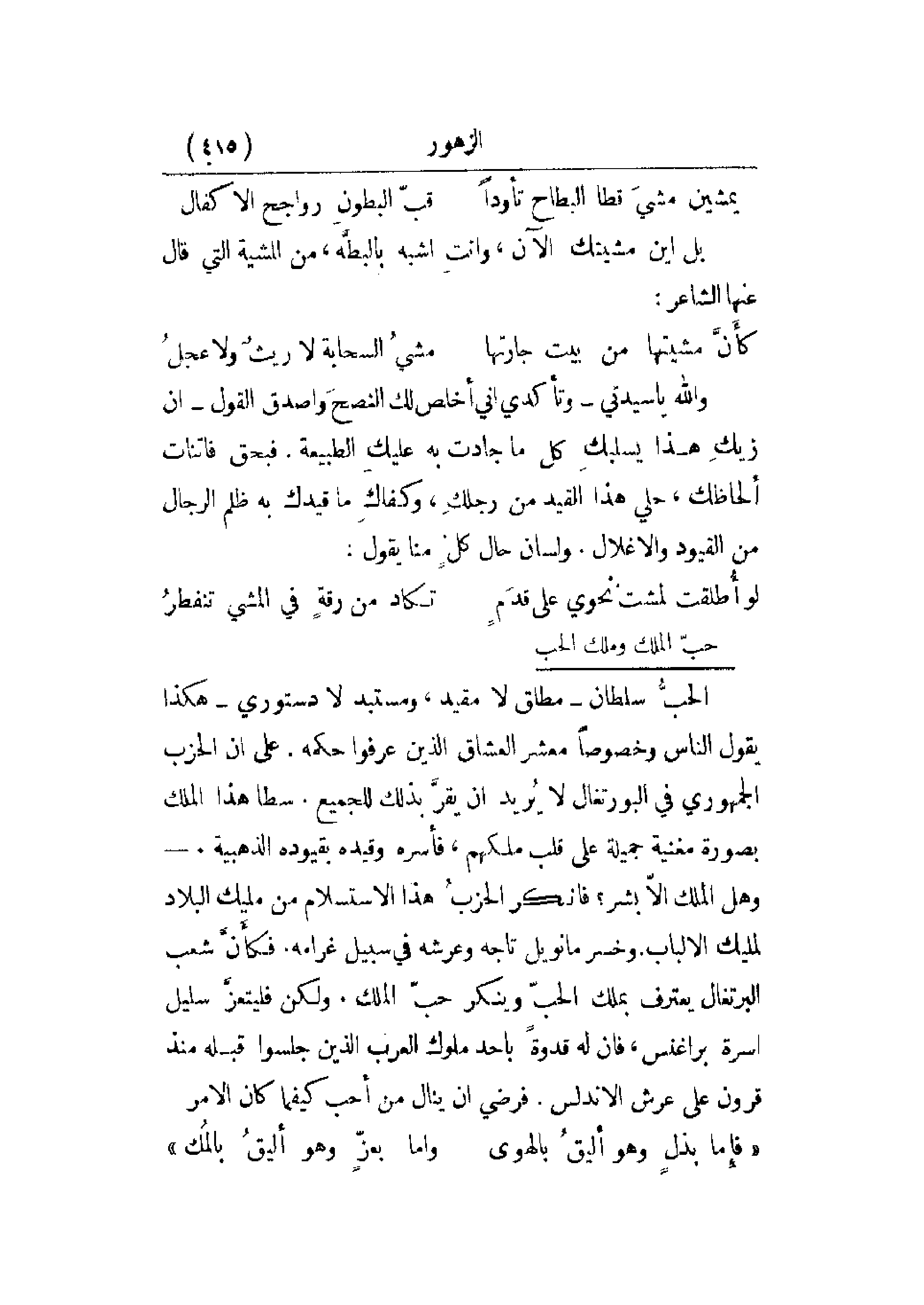 الحب سلطان - مطلق لا مقيد، ومستبد لا دستوري - هكذا يقول الناس وخصوصاً معشر العشاق الذين عرفوا حكمه. على أن الحزب الجمهوري في البرتغال لا يريد أن يقر بذلك للجميع. سطا هذا الملك بصورة مغنية جميلة على قلب ملكهم، فأسره وقيده بقيوده الذهبية. - وهل الملك إلا بشر؟ فأنكر الحزب هذا الاستسلام من مليك البلاد لمليك الألباب. وخسر مانويل تاجه وعرشه في سبيل غرامه. فكأن شعب البرتغال يعترف بملك الحب وينكر حب الملك. ولكن فليتعز سليل أسرة براغنس، فإن له قدوة بأحد ملوك العرب الذين جلسوا قبله منذ قرون على عرش الأندلس. فرضي أن ينال من أحب كيفما كان الأمر.