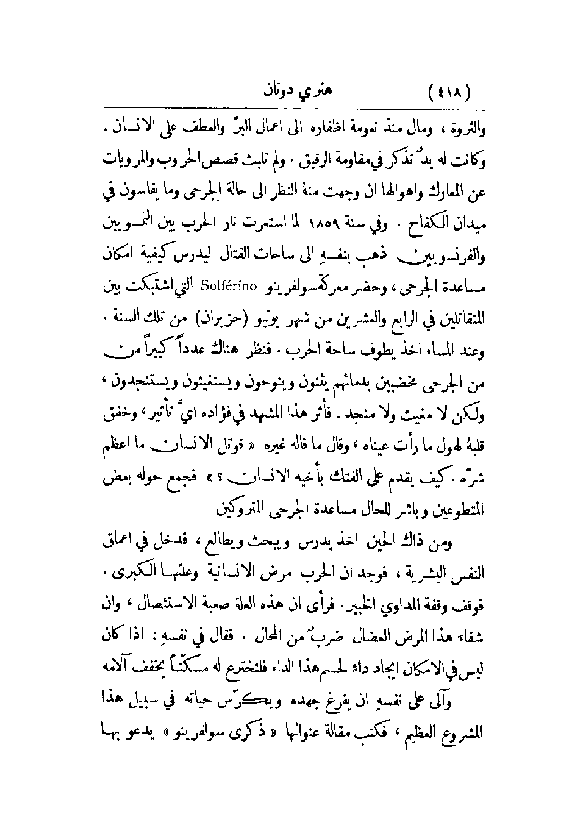 والثروة، ومال منذ نعومة أظفاره إلى أعمال البر والعطف على الإنسان. وكانت له يد تذكر في مقاومة الرقيق. ولم تلبث قصص الحروب والمرويات عن المعارك وأهوالها أن وجهت منه النظر إلى حالة الجرحى وما يقاسون في ميدان الكفاح. وفي سنة 1859 لما استعرت نار الحرب بين النمساويين والفرنسويين ذهب بنفسه إلى ساحات القتال ليدرس كيفية إمكان مساعدة الجرحى، وحضر معركة سولفرينو التي اشتبكت بين المتقاتلين في الرابع والعشرين من شهر يونيو (حزيران) من تلك السنة. وعند المساء أخذ يطوف ساحة الحرب. فنظر هناك عدداً كبيراً من الجرحى مخضبين بدمائهم يئنون وينوحون ويستغيثون ويستنجدون، ولكن لا مغيث ولا منجد. فأثر هذا المشهد في فؤاده أي تأثير، وخفق قلبه لهول ما رأت عيناه، وقال ما قاله غيره قوتل الإنسان ما أعظم شره. كيف قدم على الفتك بأخيه الإنسان؟ فجمع حوله بعض المتطوعين وباشر للحال مساعدة الجرحى المتروكين.