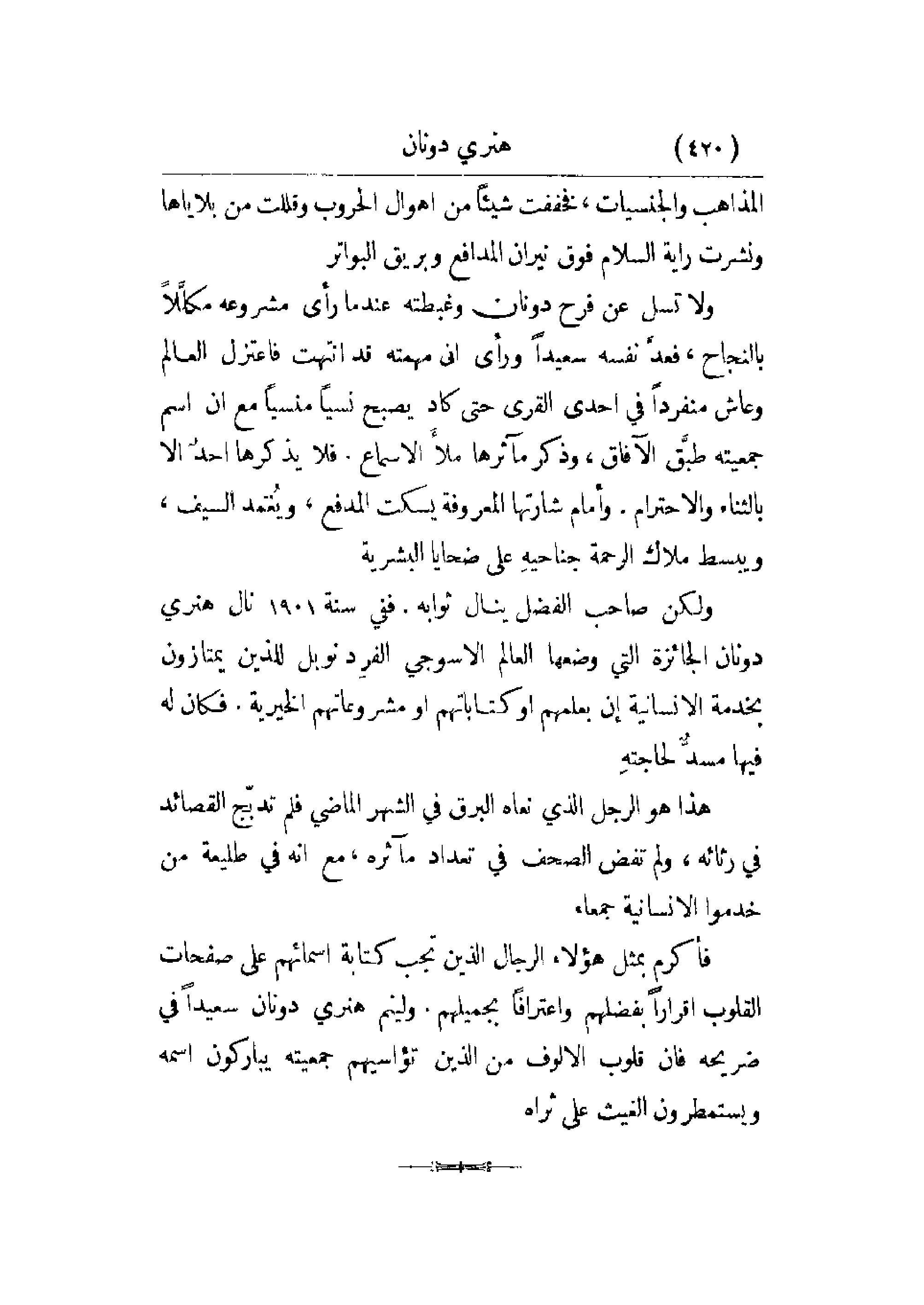 فأكرم بمثل هؤلاء الرجال الذين تجب كتابة أسمائهم على صفحات القلوب إقراراً بفضلهم واعترافاً بجميلهم. ولينم هنري دونان سعيداً في ضريحه فإن قلوب الألوف من الذين تؤاسيهم جمعيته يباركون اسمه ويستمطرون الغيث على ثراه.