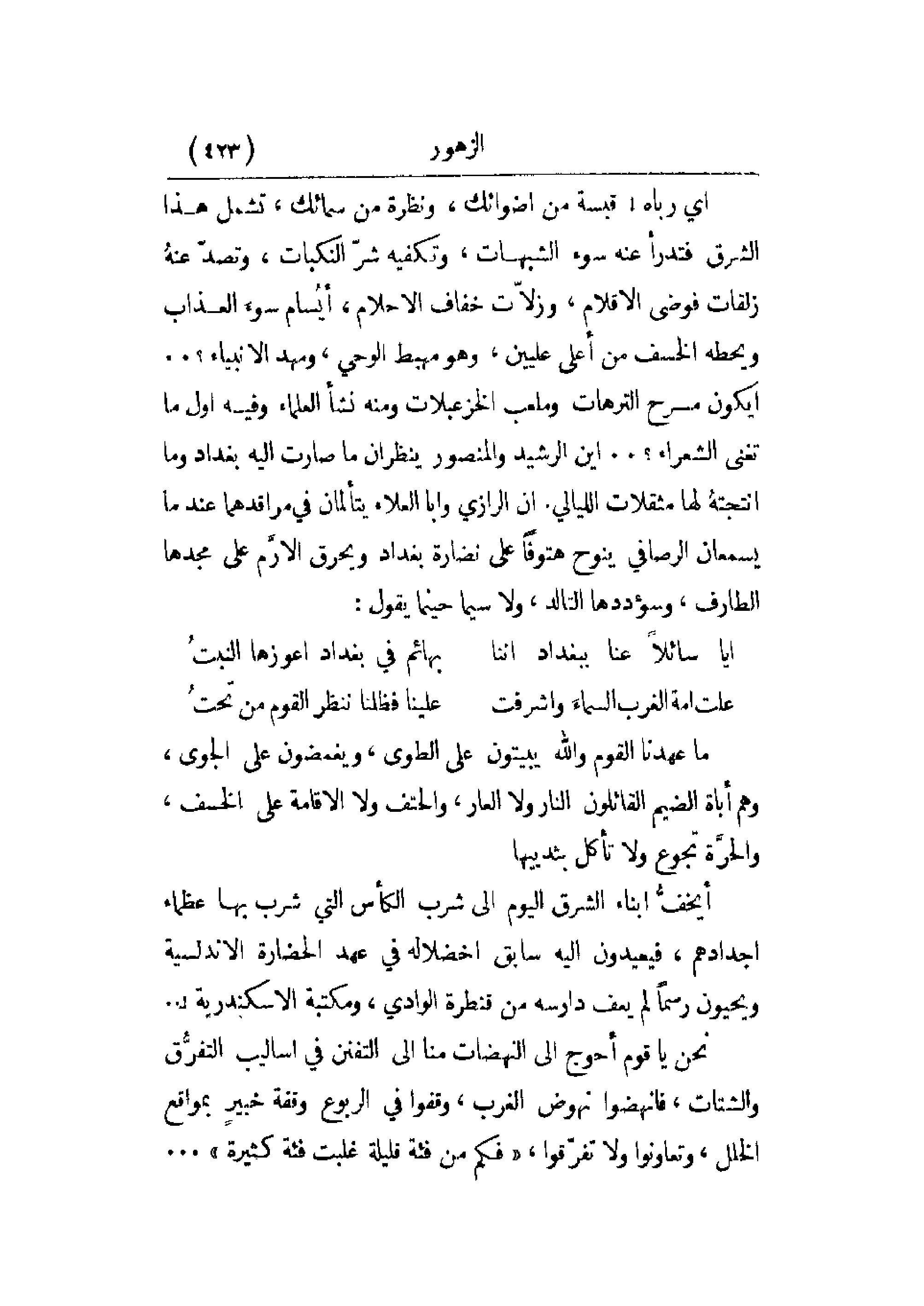 أي رباه! قبسة من أضوائك، ونظرة من سمائك، تشمل هذا الشرق فتدرأ عنه سوء الشبهات، وتكفيه شر النكبات، وتصد عنه زلقات فوضى الأقلام، وزلات خفاف الأحلام، أيسام سوء العذاب ويحطه الخسف من أعلى عليين، وهو مهبط الوحي، ومهد الأنبياء؟. . . أيكون مسرح الترهات وملعب الخزعبلات ومنه نشأ العلماء وفيه أول ما تغنى الشعراء؟. . . أين الرشيد والمنصور ينظران ما صارت إليه بغداد وما أنتجته لها مثقلات الليالي. إن الرازي وأبا العلاء يتألمان في مراقدهما عندما يسمعان الرصافي ينوح هتوفاً على نضارة بغداد ويحرق الأرم على مجدها الطارف، وسؤددها التالد، ولاسيما حينما يقول: