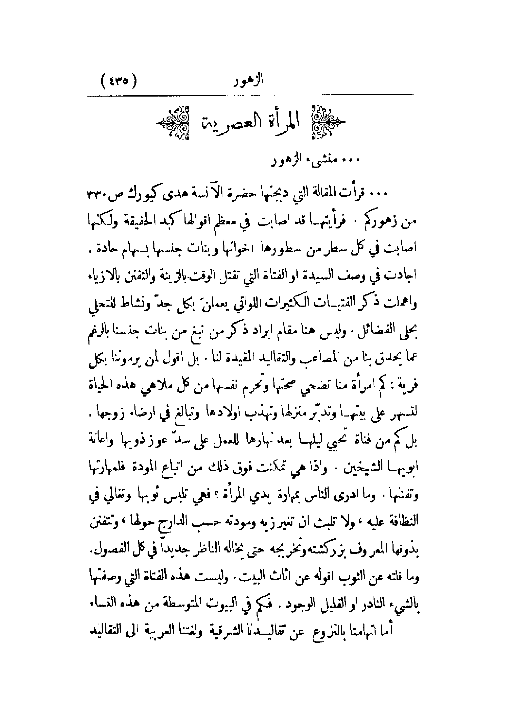 . . . . قرأت المقالة التي دبجتها حضرة الآنسة هدى كيورك ص 330 من زهوركم. فرأيتها قد أصابت في معظم أقوالها كبد الحقيقة ولكنها أصابت في كل سطر من سطورها أخواتها وبنات جنسها بسهام حادة. أجادت في وصف السيدة أو الفتاة التي تقتل الوقت بالزينة والتفنن بالأزياء وأهملت ذكر الفتيات الكثيرات اللواتي يعملن بكل جد ونشاط للتحلي بحلى الفضائل. وليس هنا مقام إيراد ذكر من نبغ من بنات جنسنا بالرغم عما يحدق بنا من المصاعب والتقاليد المقيدة لنا. بل أقول لمن يرموننا بكل فرية: كم امرأة منا تضحي صحتها وتحرم نفسها من كل ملاهي هذه الحياة لتسهر على بيتها وتدبر منزلها وتهذب أولادها وتبالغ في إرضاء زوجها. بل كم من فتاة تحيي ليلها بعد نهارها للعمل على سد عوز ذويها وإعانة أبويها الشيخين. وإذا هي تمكنت فوق ذلك من اتباع المودة فلمهارتها وتفننها. وما أدرى الناس بمهارة يدي المرأة؟ فهي تلبس ثوبها وتغالي في النظافة عليه، ولا تلبث أن تغير زيه ومودته حسب الدارج حولها، وتتفنن بذوقها المعروف بزركشته وتخريجه حتى يخالها الناظر جديداً في كل الفصول. وما قلته عن الثوب أقوله عن أثاث البيت. وليست هذه الفتاة التي وصفتها بالشيء النادر أو القليل الوجود. فكم في البيوت المتوسطة من هذه النساء.