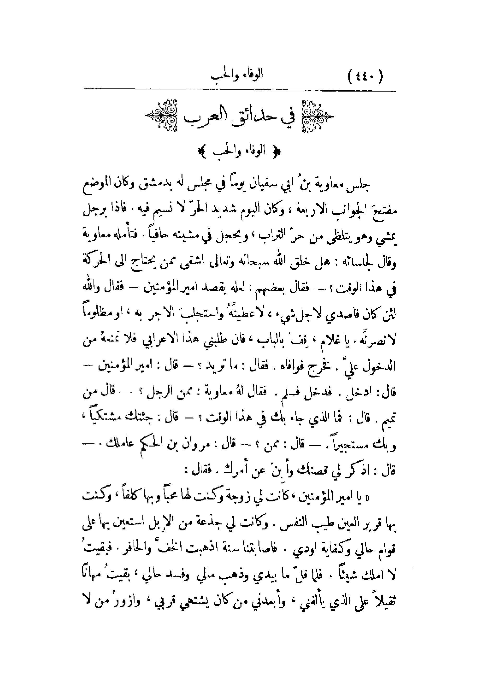 جلس معاوية بن أبي سفيان يوماً في مجلس له بدمشق وكان الموضع مفتح الجوانب الأربعة، وكان اليوم شديد الحر لا نسيم فيه. فإذا برجل يمشي وهو يتلظى من حر التراب، ويحجل في مشيته حافياً. فتأمله معاوية وقال لجلسائه: هل خلق الله سبحانه وتعالى أشقى ممن يحتاج إلى الحركة في هذا الوقت؟ - فقال بعضهم: لعله يقصد أمير المؤمنين - فقال والله لئن كان قاصدي لأجل شيء، لأعطينه واستجلب الأجر به، أو مظلوماً لأنصرنه. يا غلام، قف بالباب، فإن طلبني هذا الأعرابي فلا تمنعه من الدخول علي. فخرج فوافاه. فقال: ما تريد؟ - قال: أمير المؤمنين - قال: ادخل. فدخل فسلم. فقال له معاوية: ممن الرجل؟ - قال من تميم. قال: فما الذي جاء بك في هذا الوقت؟ - قال: جئتك مشتكياً، وبك مستجيراً - قال: ممن؟ - قال: مروان بن الحكم عاملك - قال: اذكر لي قصتك وأبن عن أمرك. فقال:
