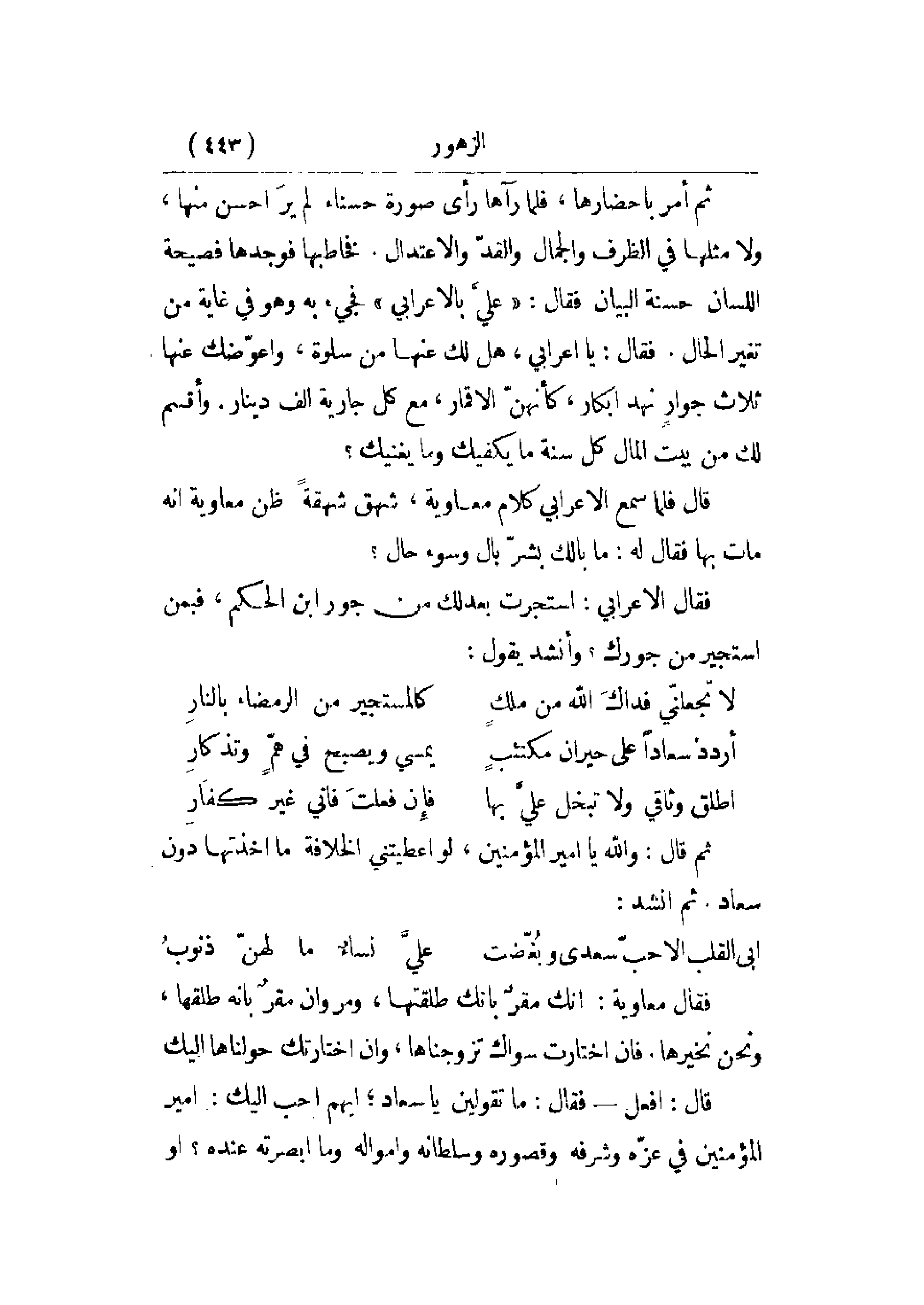قال فلما سمع الأعرابي معاوية، شهق شهقةً ظن معاوية أنه مات بها فقال له: ما بالك بشر بال وسوء حال؟