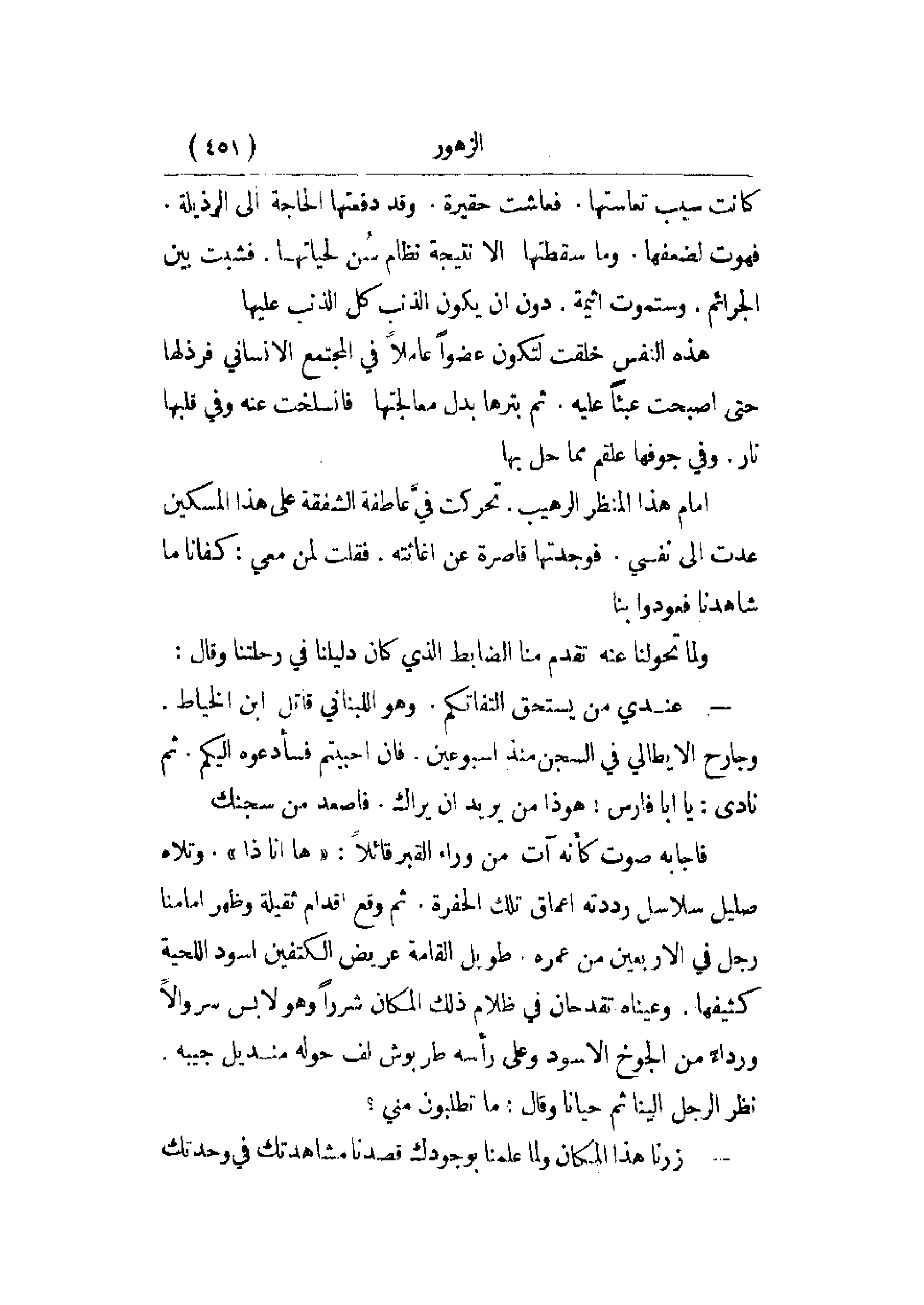 ولما تحولنا عنه تقدم منا الضابط الذي كان دليلنا في رحلتنا وقال: - عندي من يستحق التفاتكم. وهو اللبناني قاتل ابن الخياط. وجارح الإيطالي في السجن منذ أسبوعين. فإن أحببتم فسأدعوه إليكم. ثم نادى: يا أبا فارس! هو ذا من يريد أن يراك. فاصعد من سجنك.