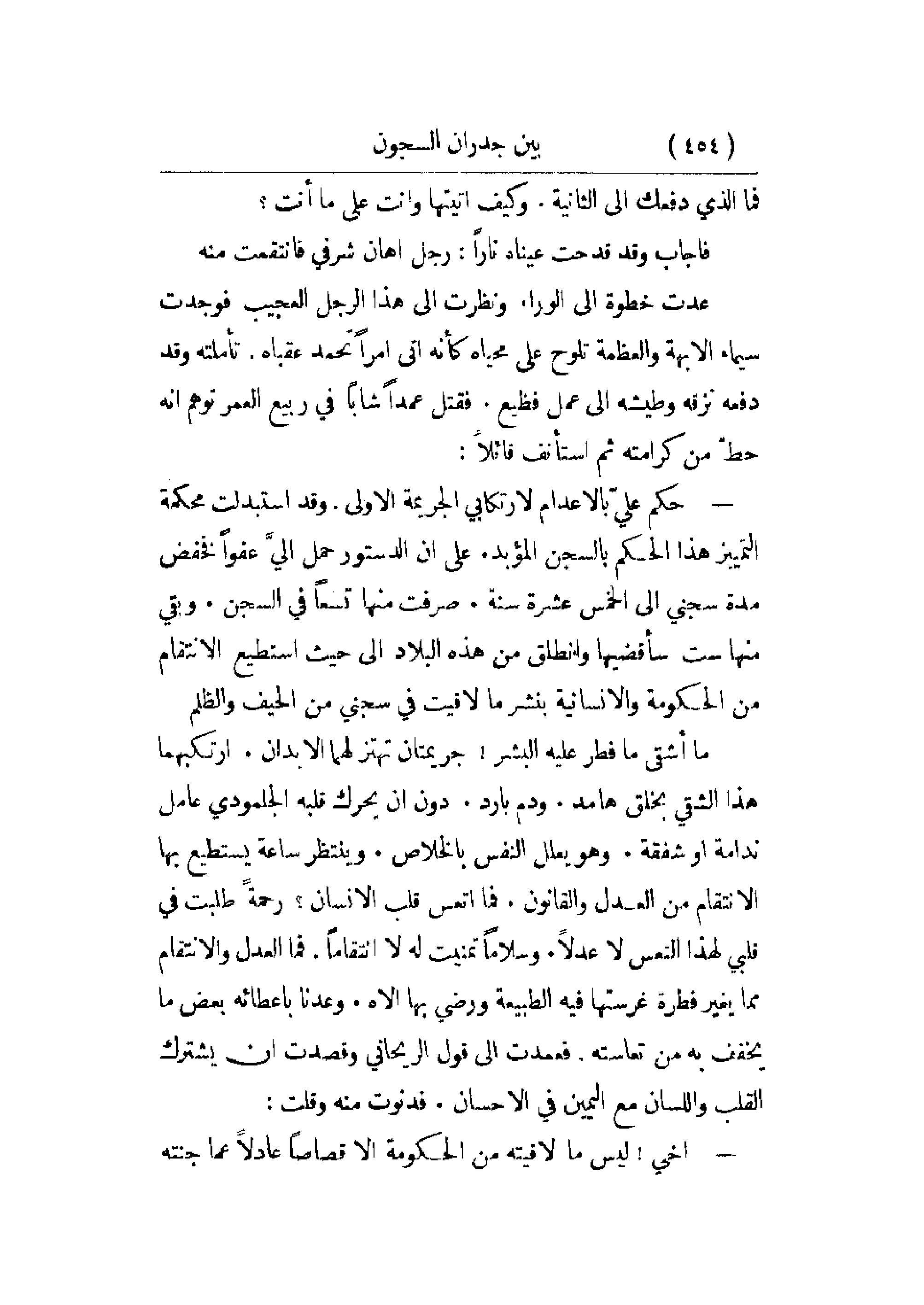 ما أشقى ما فطر عليه البشر! جريمتان تهتز لهما الأبدان. ارتكبهما هذا الشقي بخلق هامد. ودم بارد. دون أن يحرك قلبه الجلمودي عامل ندامة أو شفقة. وهو يعلل النفس بالخلاص. وينتظر ساعة يستطيع بها الانتقام من العدل والقانون. فما أتعس قلب الإنسان. رحمة طلبت فيه قلبي لهذا التعس لا عدلاً. وسلاماً تمنيت له لا انتقاماً. فما العدل والانتقام مما يغير فطرة غرستها فيه الطبيعة ورضي بها الإله. وعدنا بإعطائه بعض ما يخفف به من