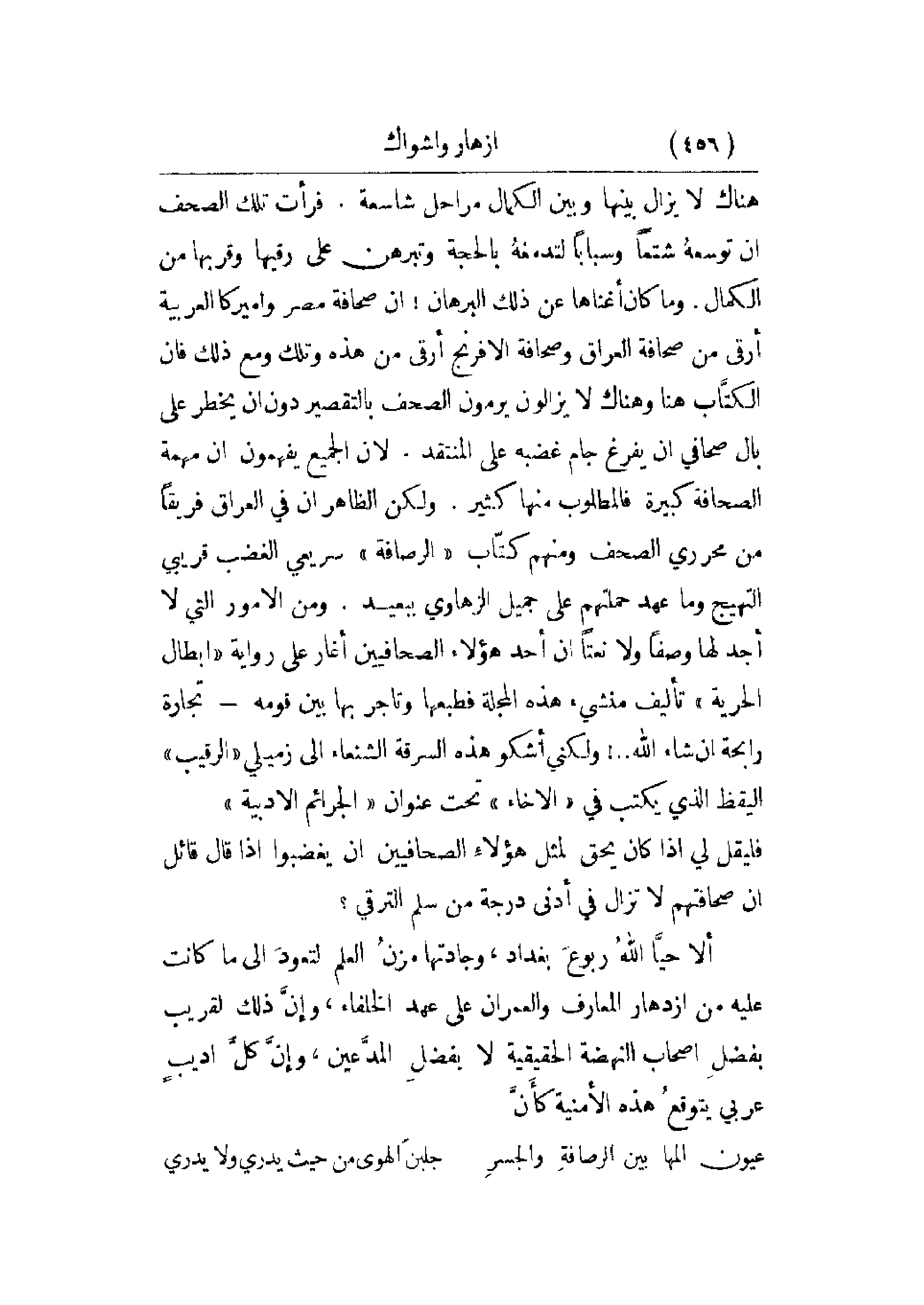 ألا حيا الله ربوع بغداد، وجادتها مزن العلم لتعود إلى ما كانت عليه من ازدهار المعارف والعمران على عهد الخلفاء، وإن ذلك لقريب بفضل أصحاب النهضة الحقيقية لا بفضل المدعين، وإن كل أديب عربي يتوقع هذه الأمنية كأن: