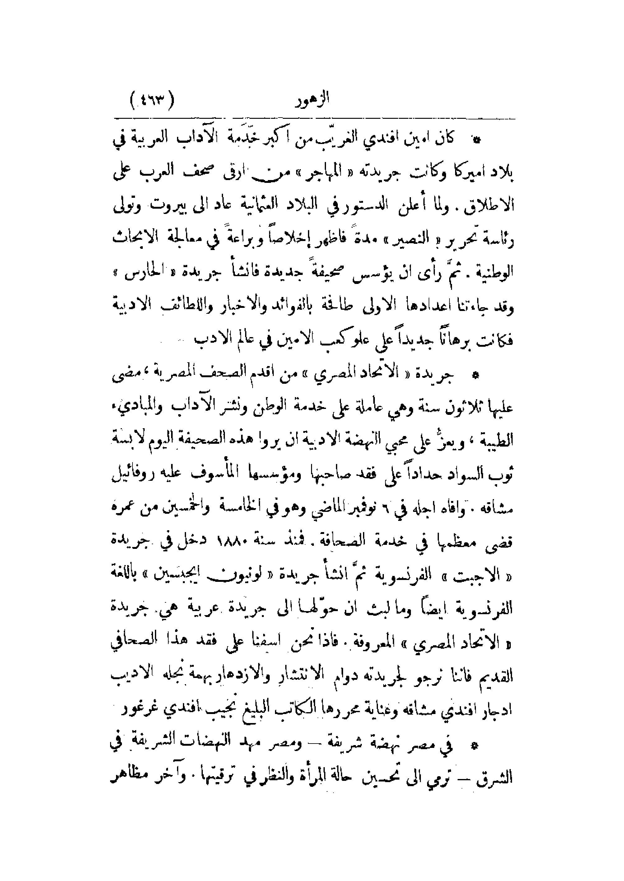 * كان أمين أفندي الغريب من أكبر خدمة الآداب العربية في بلاد أمريكا وكانت جريدته المهاجر من أرقى صحف العرب على الإطلاق. ولما أعلن الدستور في البلاد العثمانية عاد إلى بيروت وتولى رئاسة تحرير النصير مدة فأظهر إخلاصاً وبراعة في معالجة الأبحاث الوطنية. ثم رأى أن يؤسس صحيفةً جديدة فأنشأ جريدة الحارس وقد جاءتنا أعدادها الأولى طافحة بالفوائد والأخبار واللطائف الأدبية فكانت برهاناً جديداً على علو كعب الأمين في عالم الأدب.