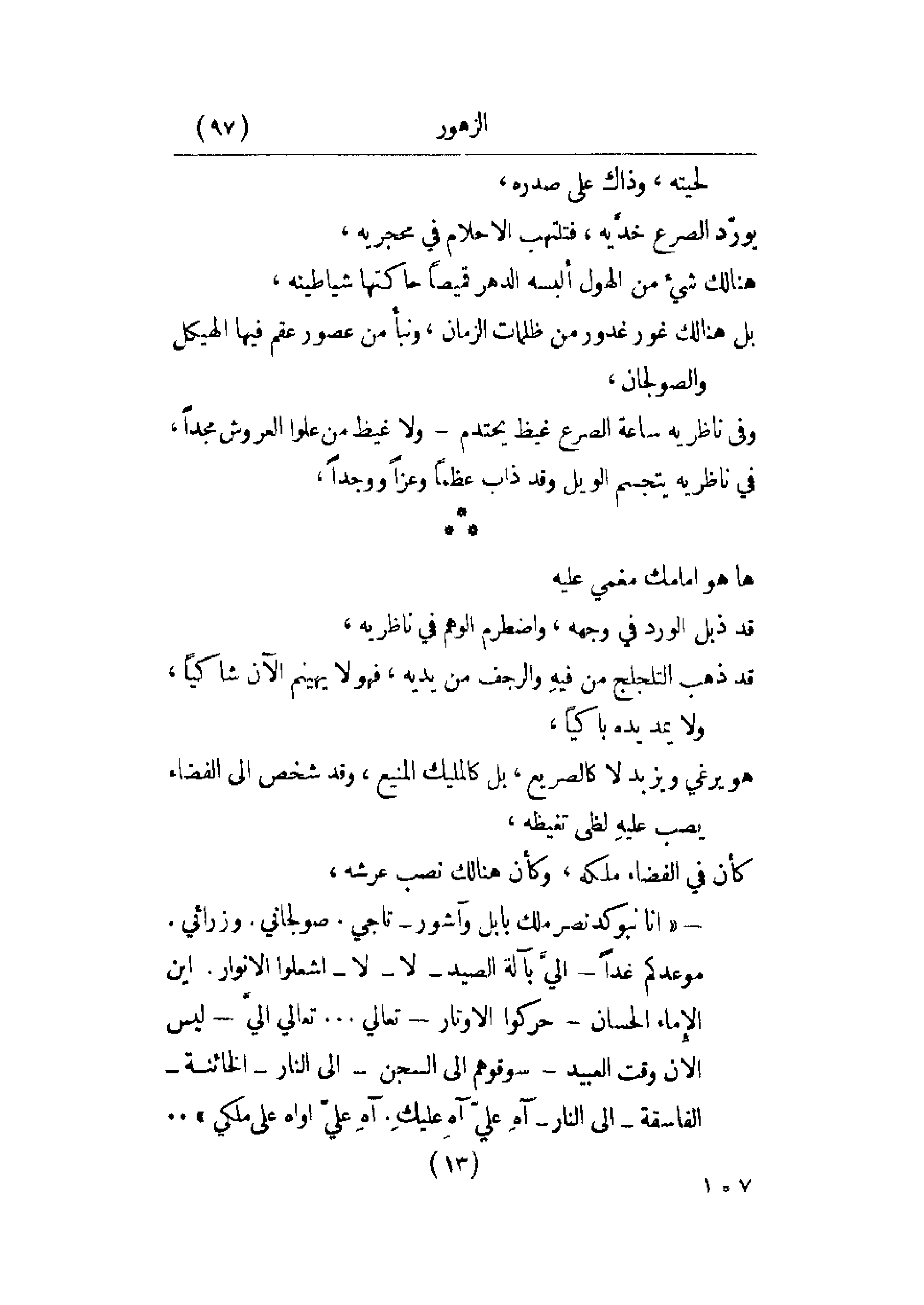 الصيد - لا - لا - أشعلوا الأنوار. أين الإماء الحسان - حركوا الأوتار - تعالي. . . تعالي إلي - ليس الآن وقت العبيد - سوقوهم إلى السجن - إلى النار - الخائنة - الفاسقة - إلى النار - آه علي آه عليك. آه علي أو آه على ملكي. .