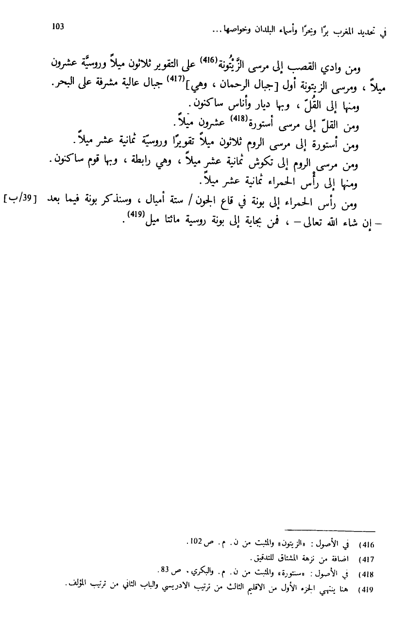 (¬419) هنا ينتهي الجزء الأول من الاقليم الثالث من ترتيب الادريسي والباب الثاني من ترتيب المؤلف.