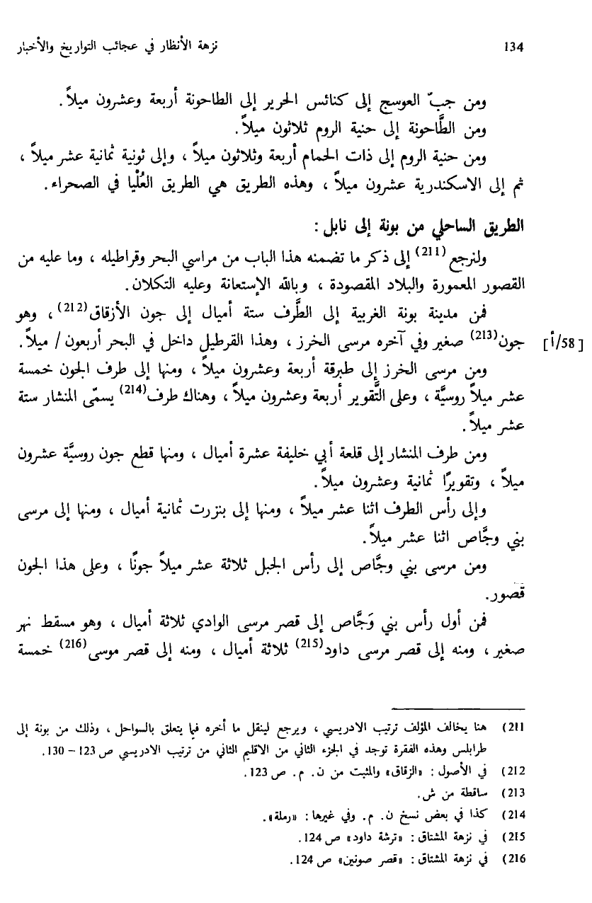 (¬211) هنا يخالف المؤلف ترتيب الادريسي، ويرجع لينقل ما أخره فيما يتعلق بالسواحل، وذلك من بونة إلى طرابلس وهذه الفقرة توجد في الجزء الثاني من الاقليم الثاني من ترتيب الادريسي ص: 123 - 130.