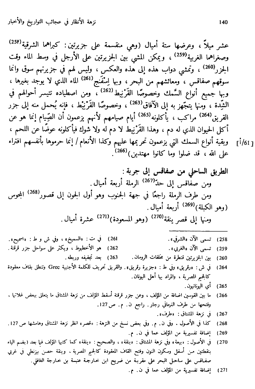 (¬266) ما بين القوسين اضافة من المؤلف، وعن جزر قرقنة أسقط المؤلف من نزهة المشتاق ما يتعلق ببعض غلاتها، وفتحها من طرف النرماني رجار. راجع ن. م. ص: 127.