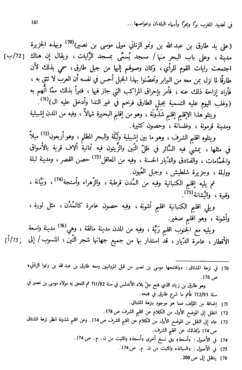 (¬70) في نزهة المشتاق: «وافتتحها موسى بن نصير من قبل المروانيين ومعه طارق بن عبد الله بن ونموا الزناتي» ص: 176. وهو طارق بن زياد الذي فتح جلّ بلاد الأندلس في سنة 92/ 711 ثم التحق به مولاه موسى بن نصير في سنة 93/ 712 فأتم ما شرع طارق في فتحه.