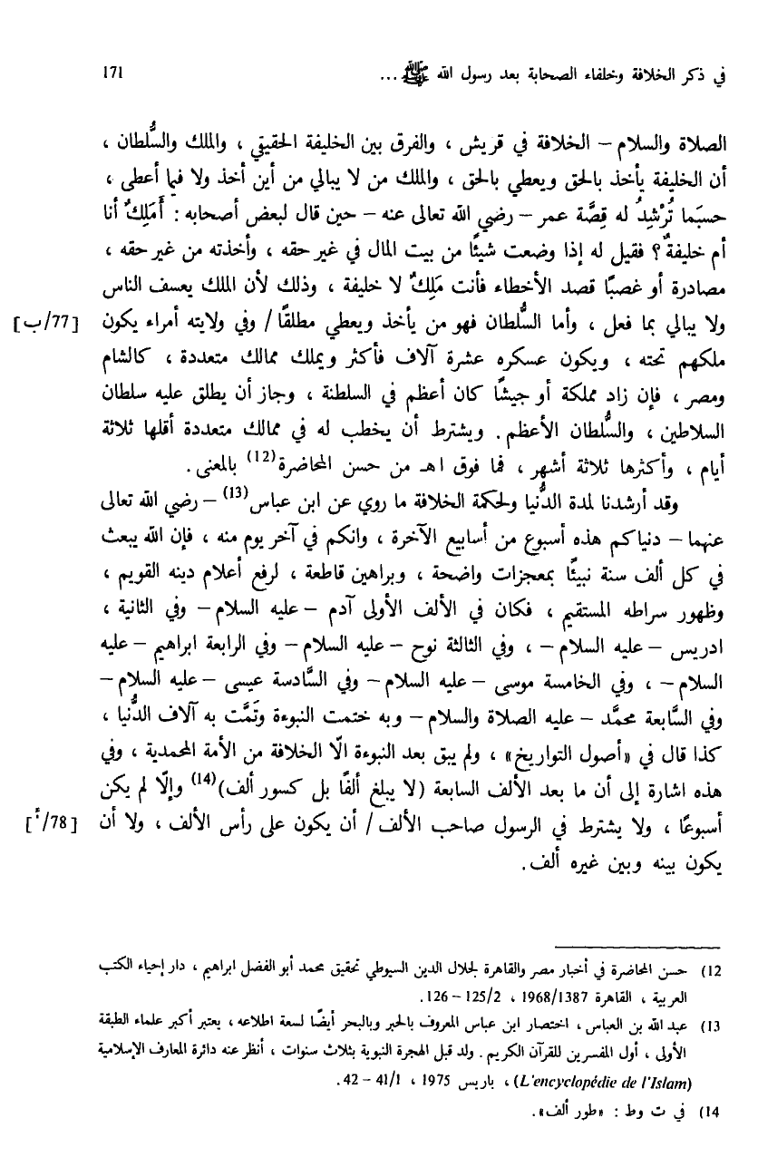 وقد أرشدنا لمدة الدّنيا ولحكمة الخلافة ما روي عن ابن عباس (¬13) - رضي الله تعالى عنهما - دنياكم هذه أسبوع من أسابيع الآخرة، وانكم في آخر يوم منه، فإن الله يبعث في كل ألف سنة نبيئا بمعجزات واضحة، وبراهين قاطعة، لرفع أعلام دينه القويم، وظهور سراطه المستقيم، فكان في الألف الأولى آدم - عليه السلام - وفي الثانية، ادريس - عليه السلام -، وفي الثالثة نوح - عليه السلام - وفي الرابعة ابراهيم - عليه السلام -، وفي الخامسة موسى - عليه السلام - وفي السّادسة عيسى - عليه السلام - وفي السّابعة محمّد - عليه الصلاة والسلام - وبه ختمت النبوءة وتمّت به آلاف الدّنيا، كذا قال في «أصول التواريخ»، ولم يبق بعد النبوءة الاّ الخلافة من الأمة المحمدية، وفي هذه اشارة إلى أن ما بعد الألف السابعة (لا يبلغ ألفا بل كسور ألف) (¬14) وإلاّ لم يكن أسبوعا، ولا يشترط في الرسول صاحب الألف / أن يكون على رأس الألف، ولا أن يكون بينه وبين غيره ألف.