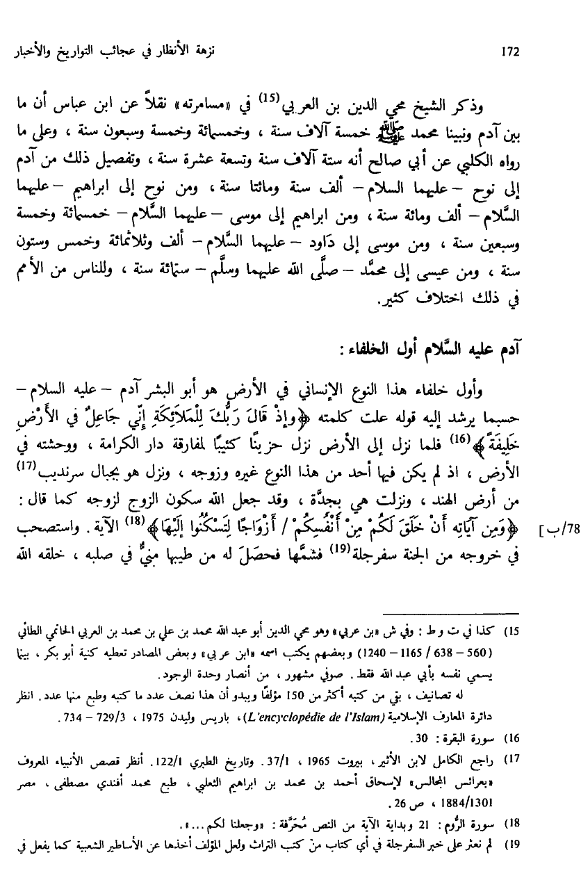 (¬15) كذا في ت وط: وفي ش «بن عربي» وهو محي الدين أبو عبد الله محمد بن علي بن محمد بن العربي الحاتمي الطائي (560 - 638/ 1165 - 1240) وبعضهم يكتب اسمه «ابن عربي» وبعض المصادر تعطيه كنية أبو بكر، بينما يسمي نفسه بأبي عبد الله فقط. صوفي مشهور، من أنصار وحدة الوجود. له تصانيف، بقي من كتبه أكثر من 150 مؤلفا ويبدو أن هذا نصف عدد ما كتبه وطبع منها عدد. انظر دائرة المعارف الإسلامية، (L' encylopedie de l' Islam) باريس وليدن 1975، 3/ 729 - 734.
