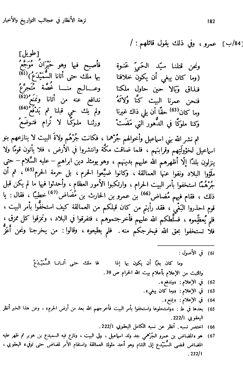 (¬67) هو «المضاض بن عمرو الجرهمي جد ولد اسماعيل، ولي البيت، ونازع فيه السميدع بن هوبر ثم ظهر عليه المضاض فمضى السّميدع إلى الشام وهو أحد ملوك العمالقة واستقام الأمر لمضاض حتى توفي» اليعقوبي، 1/ 222.