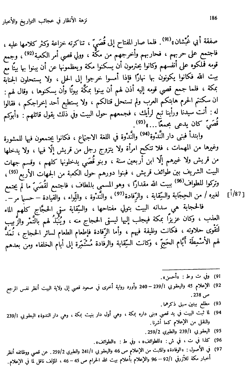 (¬94) لما ثبت البيت في يد قصي «بنى داره بمكة، وهي أول دار بنيت بمكة، وهي دار الندوة» اليعقوبي 1/ 239 والنقل من الإعلام كما أشرنا.